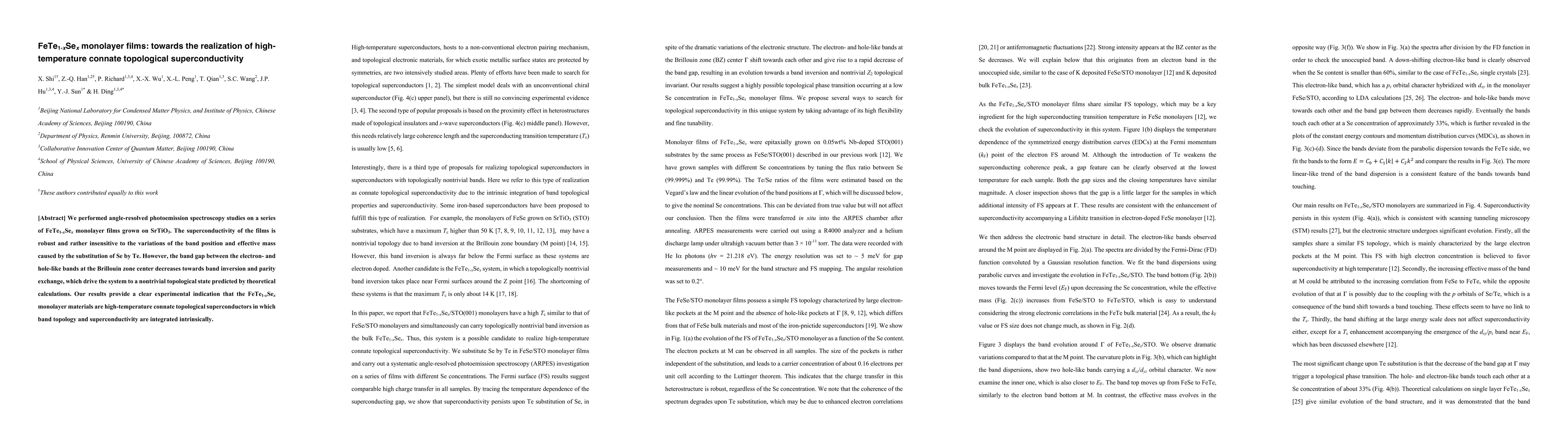 This study uses angle-resolved photoemission spectroscopy to investigate FeTe$_{1-x}$Se$_{x}$ monolayer films, revealing robust superconductivity unaffected by band variations. The material transitions towards a high-temperature connate topological superconductor state, as evidenced by decreasing band gap and predicted band inversion.