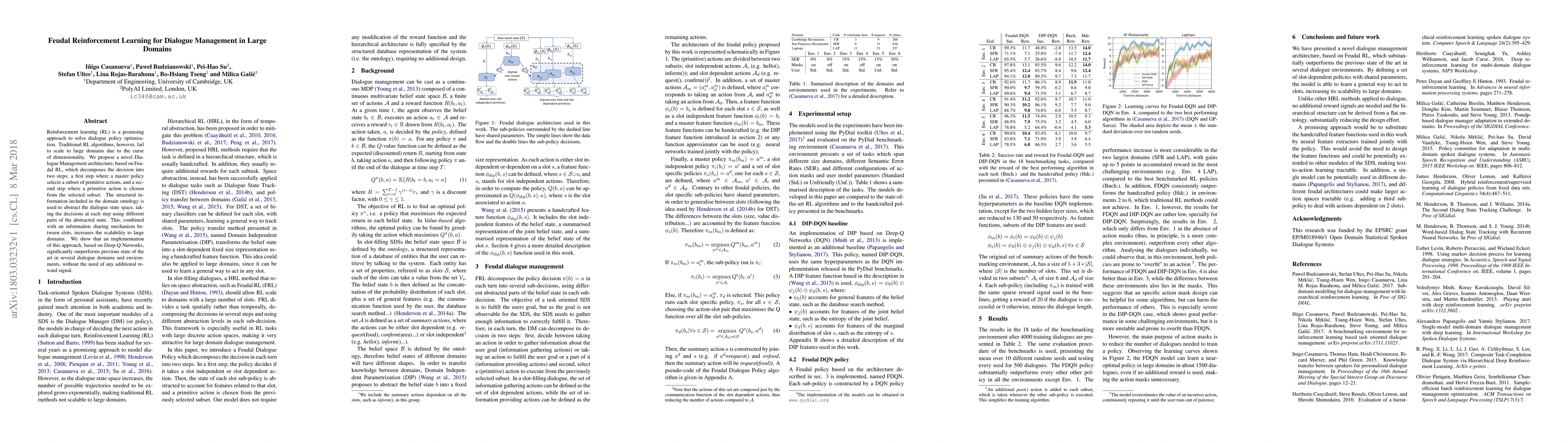 This paper proposes a Feudal Reinforcement Learning architecture for dialogue management that scales to large domains by decomposing decisions into two steps, leveraging domain ontology to abstract the state space and improve scalability. The approach, implemented with Deep-Q Networks, outperforms previous methods without additional reward signals.