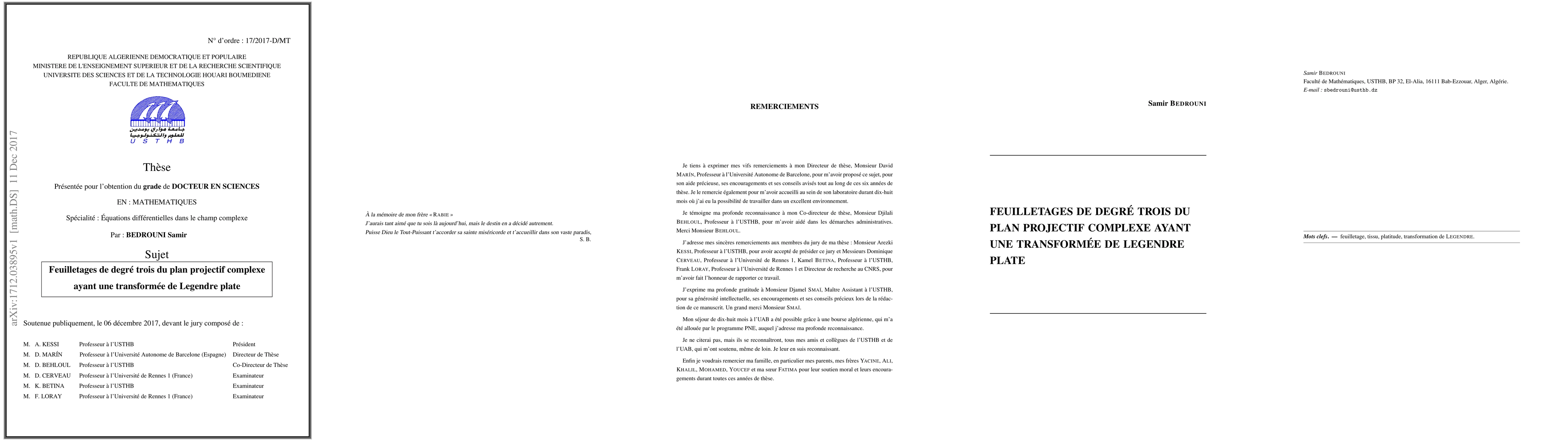 The set $\mathbf{F}(d)$ of foliations of degree $d$ on the complex projective plane can be identified with a Zariski's open set of a projective space of dimension $(d+2)^2-2$ on which acts $\mathrm{Aut}(\mathbb{P}^{2}_{\mathbb{C}})$. The subset $\mathbf{FP}(d)$ of $\mathbf{F}(d)$ consisting of foliations of $\mathbf{F}(d)$ with a flat Legendre transform (dual web) is a Zariski closed subset of $\mathbf{F}(d)$. In this dissertation we study foliations of $\mathbf{FP}(d)$ and we try to better understand the topological structure of $\mathbf{FP}(3)$. First, we establish some effective criteria for the flatness of the dual $d$-web of a homogeneous foliation of degree $d$ and we describe some explicit examples. We will see also that it is possible, under certain assumptions, to bring the study of flatness of the dual web of a general foliation to the homogeneous framework. Second, we classify up to automorphism of $\mathbb{P}^{2}_{\mathbb{C}}$ the elements of $\mathbf{FP}(3)$. More precisely, we show that up to automorphism there are $16$ foliations of degree $3$ with a flat Legendre transform. From this classification we deduce that $\mathbf{FP}(3)$ has exactly $12$ irreducible components.