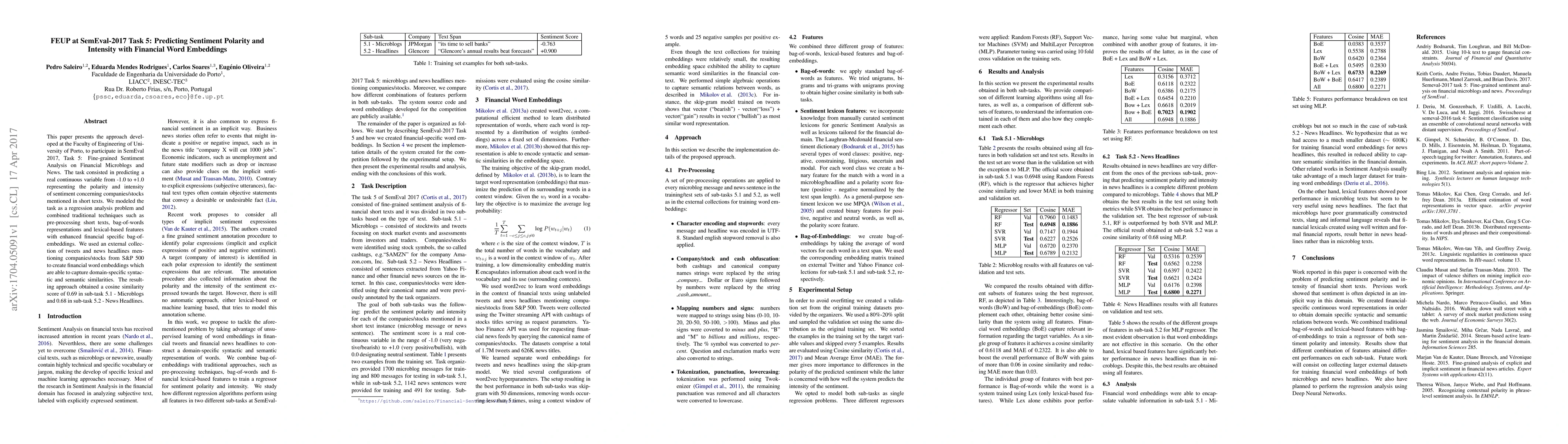 This paper details the University of Porto's approach for SemEval 2017 Task 5, using financial word embeddings to predict sentiment polarity and intensity in financial texts. The team combined traditional text processing with domain-specific embeddings, achieving cosine similarity scores of 0.69 and 0.68 for microblogs and news headlines respectively.