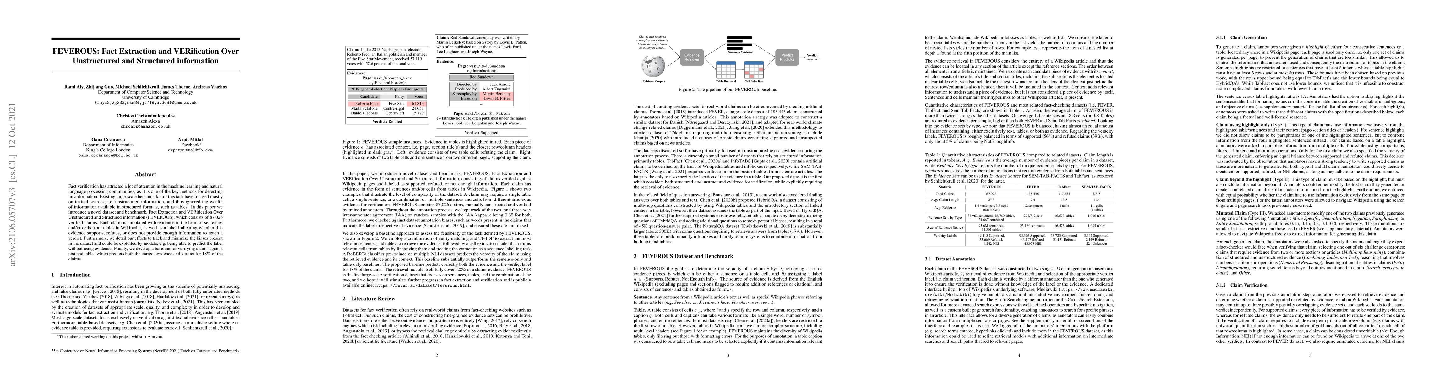 FEVEROUS is a novel dataset and benchmark for fact verification over both unstructured text and structured table data, aiming to address the gap in existing benchmarks. It introduces 87,026 verified claims with annotated evidence and labels, and includes efforts to minimize biases, alongside a baseline model achieving 18% accuracy in claim verification.