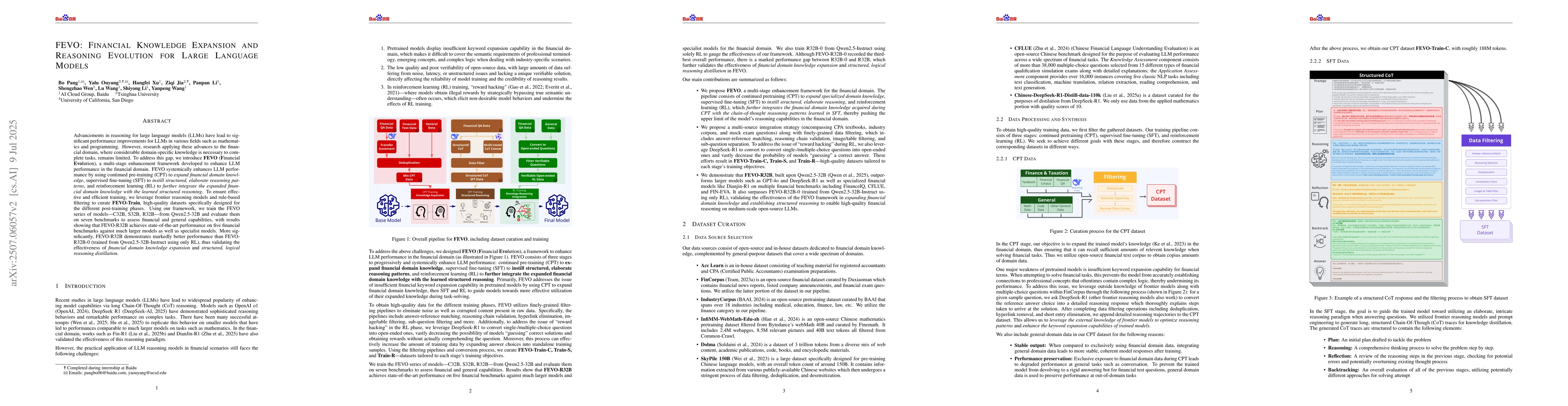 Advancements in reasoning for large language models (LLMs) have lead to significant performance improvements for LLMs in various fields such as mathematics and programming. However, research applying these advances to the financial domain, where considerable domain-specific knowledge is necessary to complete tasks, remains limited. To address this gap, we introduce FEVO (Financial Evolution), a multi-stage enhancement framework developed to enhance LLM performance in the financial domain. FEVO systemically enhances LLM performance by using continued pre-training (CPT) to expand financial domain knowledge, supervised fine-tuning (SFT) to instill structured, elaborate reasoning patterns, and reinforcement learning (RL) to further integrate the expanded financial domain knowledge with the learned structured reasoning. To ensure effective and efficient training, we leverage frontier reasoning models and rule-based filtering to curate FEVO-Train, high-quality datasets specifically designed for the different post-training phases. Using our framework, we train the FEVO series of models - C32B, S32B, R32B - from Qwen2.5-32B and evaluate them on seven benchmarks to assess financial and general capabilities, with results showing that FEVO-R32B achieves state-of-the-art performance on five financial benchmarks against much larger models as well as specialist models. More significantly, FEVO-R32B demonstrates markedly better performance than FEVO-R32B-0 (trained from Qwen2.5-32B-Instruct using only RL), thus validating the effectiveness of financial domain knowledge expansion and structured, logical reasoning distillation