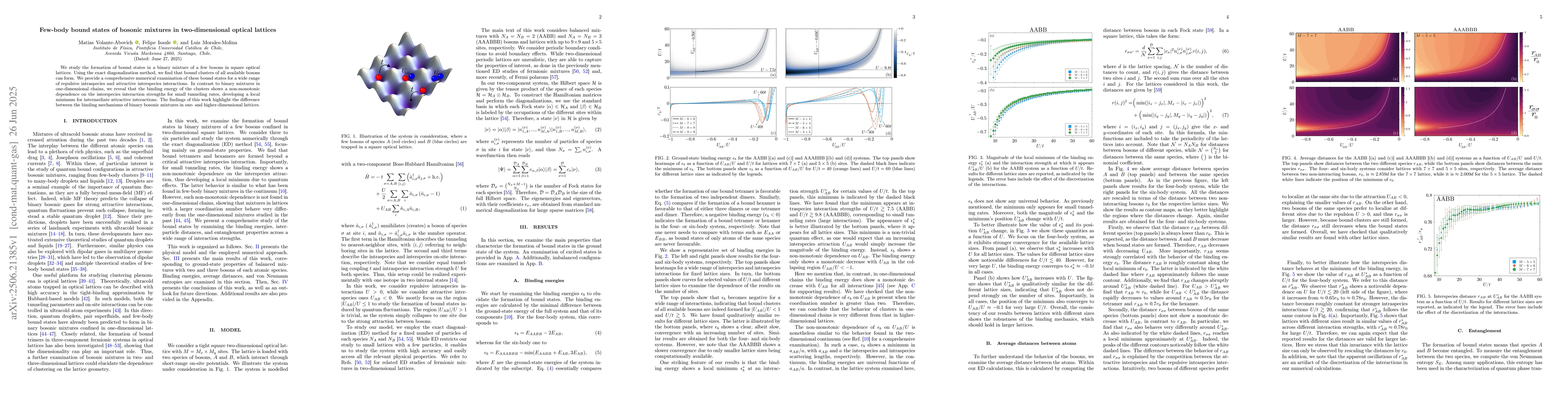 The work provides a detailed numerical characterization of few-body bound states, their energies, distances, and entanglement properties in two-dimensional lattices, revealing non-trivial dependence on interaction parameters.