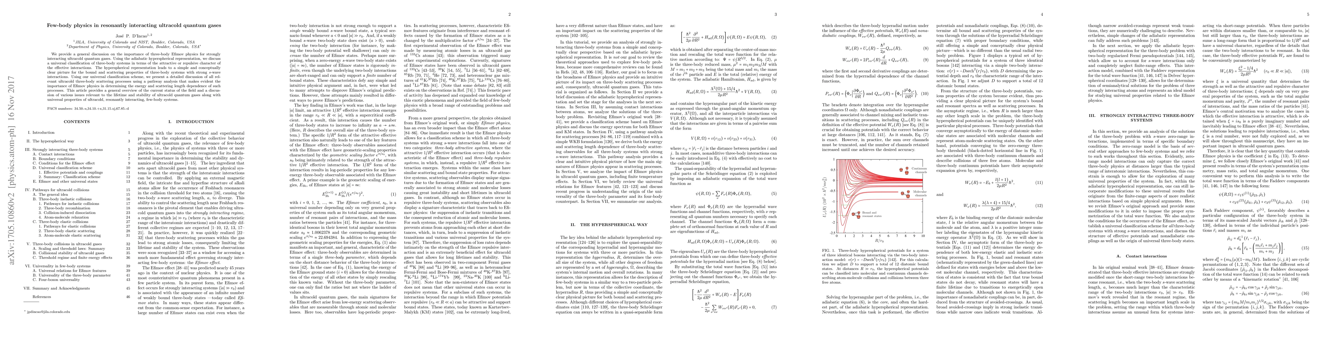 This paper reviews the significance of Efimov physics in three-body interactions within ultracold quantum gases, using the adiabatic hyperspherical representation to classify systems based on effective interactions. It emphasizes the impact of Efimov effects on scattering processes and discusses the stability and lifetime of these gases.