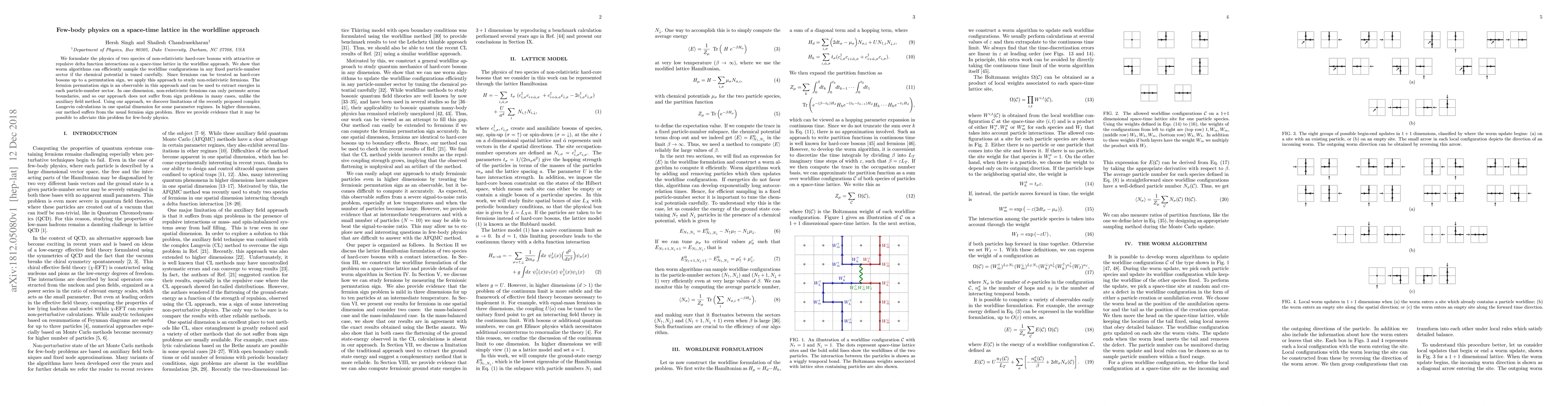 This paper introduces a worldline approach to study few-body physics of non-relativistic hard-core bosons and fermions on a space-time lattice. It demonstrates that worm algorithms can efficiently sample configurations, avoiding sign problems in one dimension, and offers evidence that the sign problem in higher dimensions might be alleviable for few-body physics.