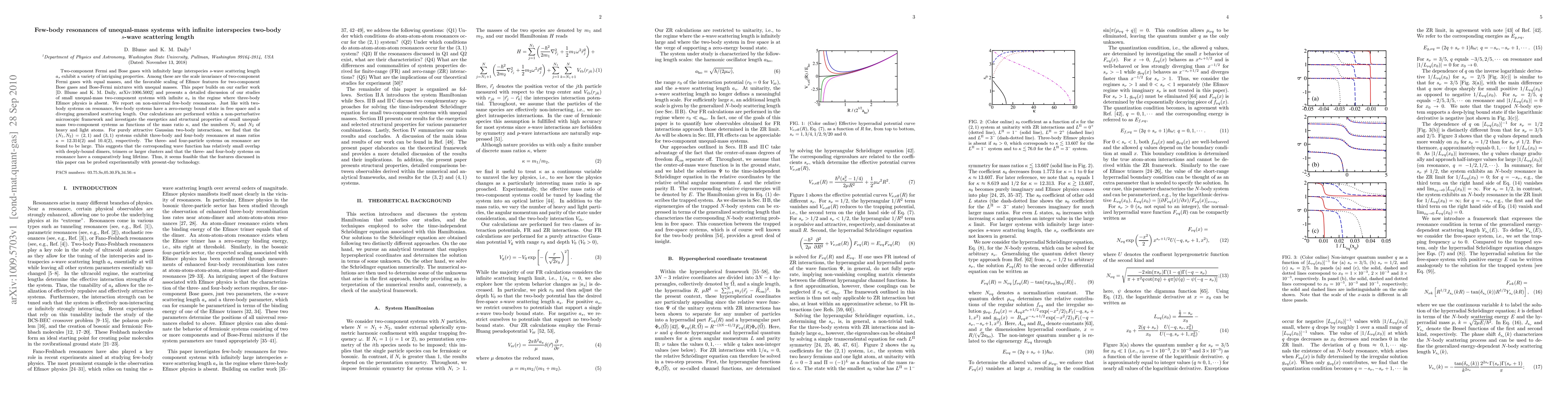 This paper investigates few-body resonances in unequal-mass two-component Fermi and Bose gases with infinite interspecies s-wave scattering length, revealing non-universal resonances and zero-energy bound states. Experimental probing of these resonances, especially in $(N_1,N_2)=(2,1)$ and $(3,1)$ systems, is suggested as feasible with current technology.