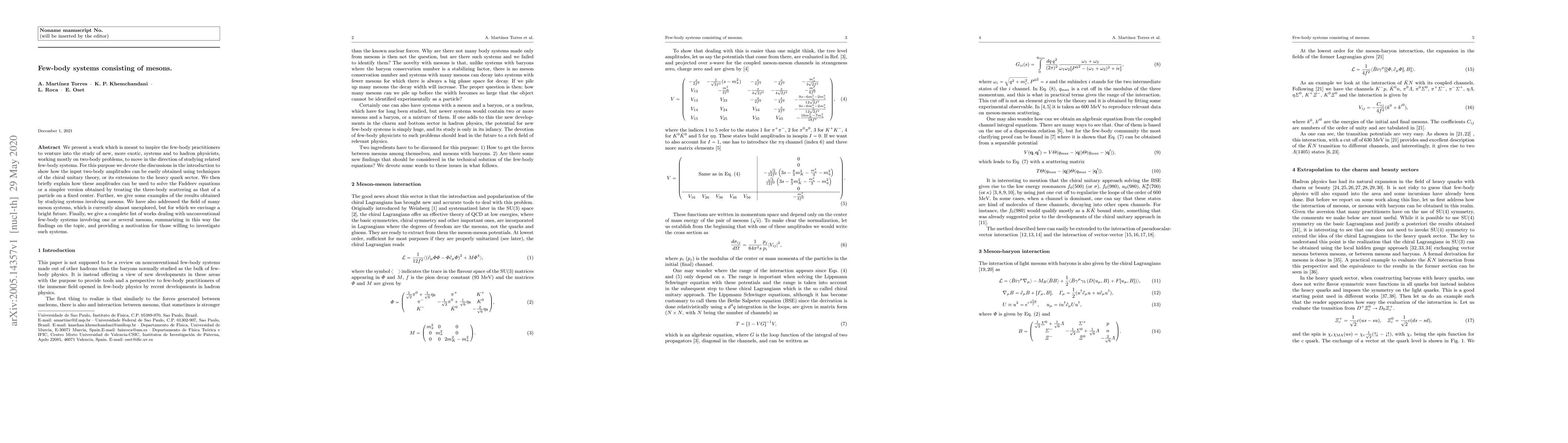 We present a work which is meant to inspire the few-body practitioners to venture into the study of new, more exotic, systems and to hadron physicists, working mostly on two-body problems, to move in the direction of studying related few-body systems. For this purpose we devote the discussions in the introduction to show how the input two-body amplitudes can be easily obtained using techniques of the chiral unitary theory, or its extensions to the heavy quark sector. We then briefly explain how these amplitudes can be used to solve the Faddeev equations or a simpler version obtained by treating the three-body scattering as that of a particle on a fixed center. Further, we give some examples of the results obtained by studying systems involving mesons. We have also addressed the field of many meson systems, which is currently almost unexplored, but for which we envisage a bright future. Finally, we give a complete list of works dealing with unconventional few-body systems involving one or several mesons, summarizing in this way the findings on the topic, and providing a motivation for those willing to investigate such systems.
