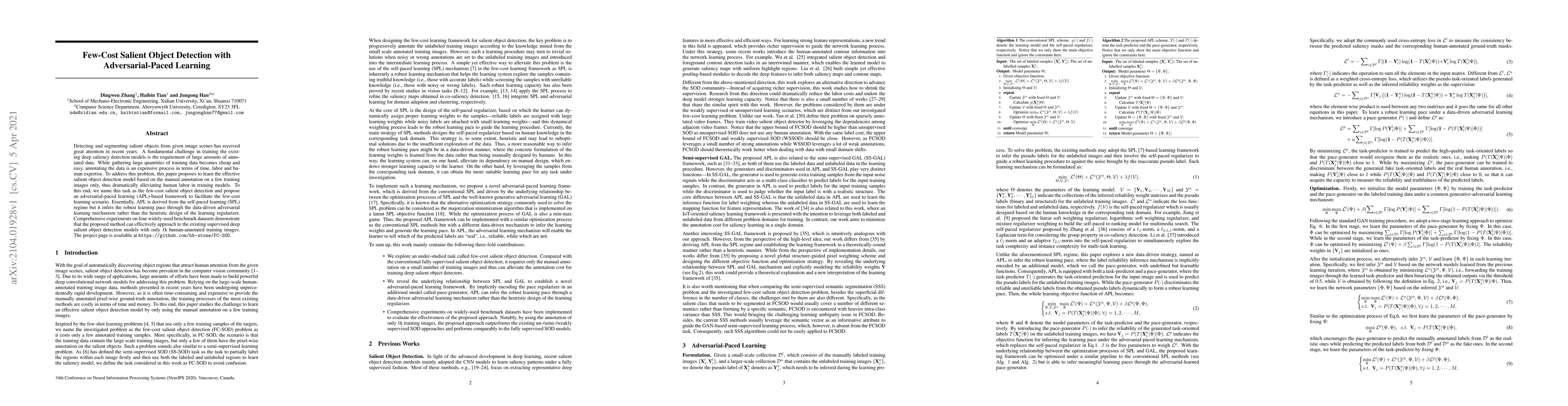 The paper proposes an adversarial-paced learning (APL) framework for few-cost salient object detection, derived from self-paced learning (SPL) but inferring robust learning pace via data-driven adversarial learning. It introduces a global structure-guided pixel weighting scheme to infer region reliability.