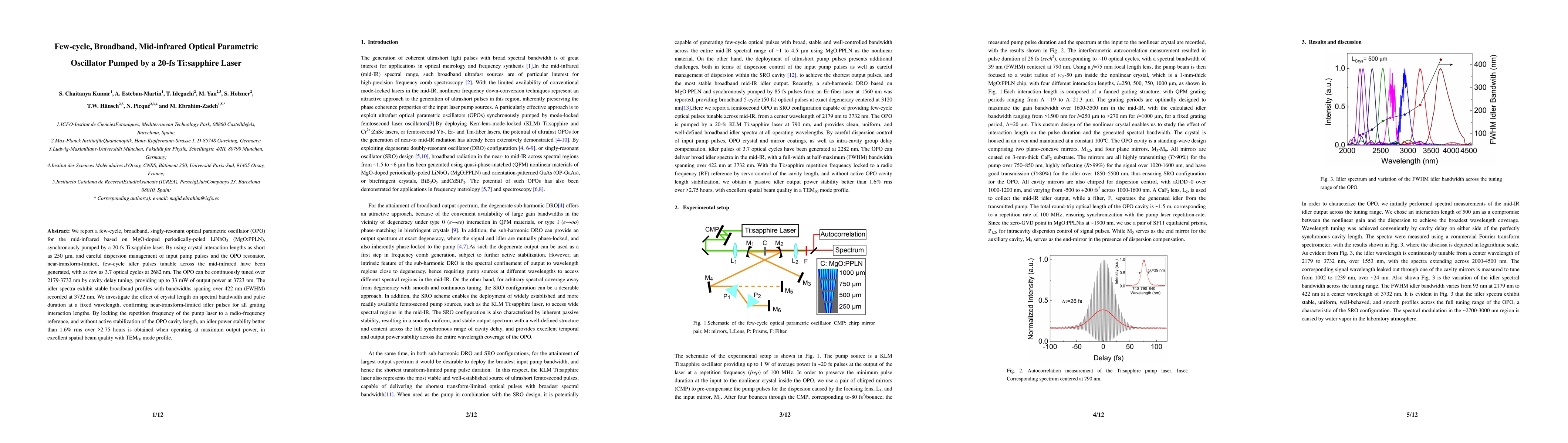 This paper reports the development of a few-cycle, broadband mid-infrared optical parametric oscillator (OPO) pumped by a 20-fs Ti:sapphire laser, achieving near-transform-limited pulses with as few as 3.7 cycles at 2682 nm. The OPO, based on MgO:PPLN, can be continuously tuned over 2179-3732 nm, providing up to 33 mW of output power and maintaining idler power stability better than 1.6% rms over 2.75 hours.