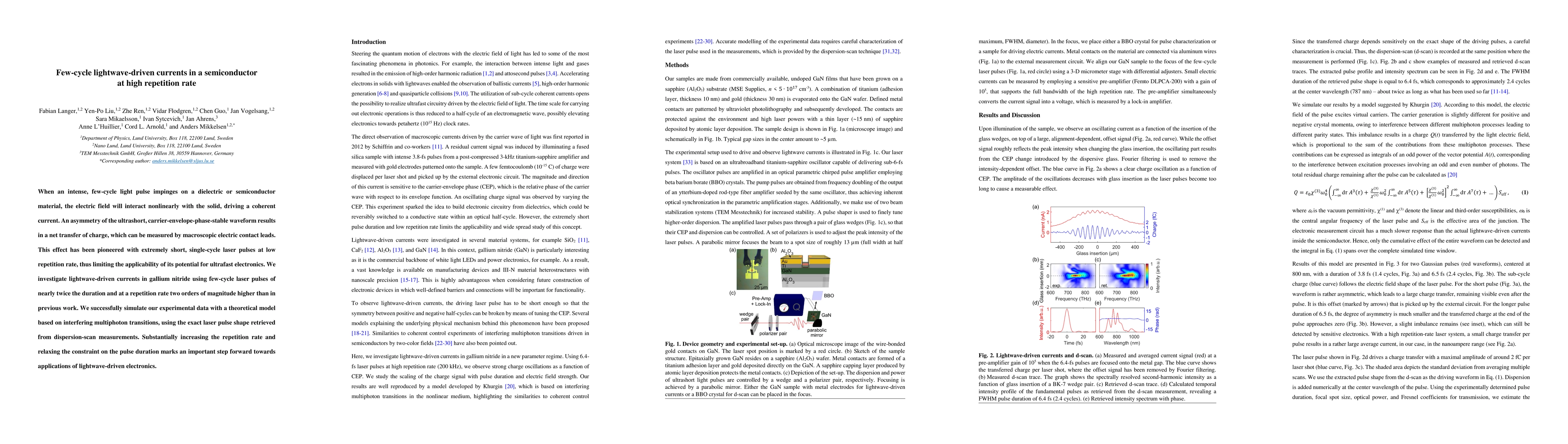 This paper investigates few-cycle lightwave-driven currents in gallium nitride using laser pulses at high repetition rates, demonstrating a significant advancement over previous single-cycle, low repetition rate experiments. The study successfully models the observed currents with a theoretical framework based on multiphoton transitions, marking progress towards practical lightwave-driven electronics.