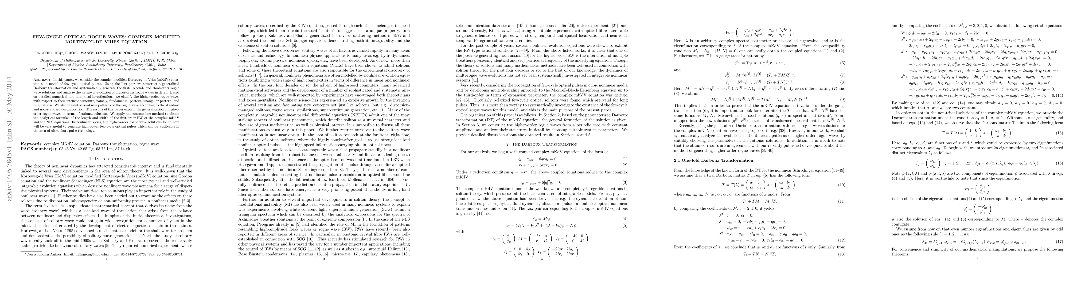 This paper investigates few-cycle optical rogue waves using the complex modified Korteweg-de Vries equation, generating and classifying higher-order rogue wave solutions through generalized Darboux transformations. The findings reveal new patterns and analytical formulas for the dimensions of first-order rogue waves, with implications for generating high-power few-cycle optical pulses in ultra-short pulse technology.