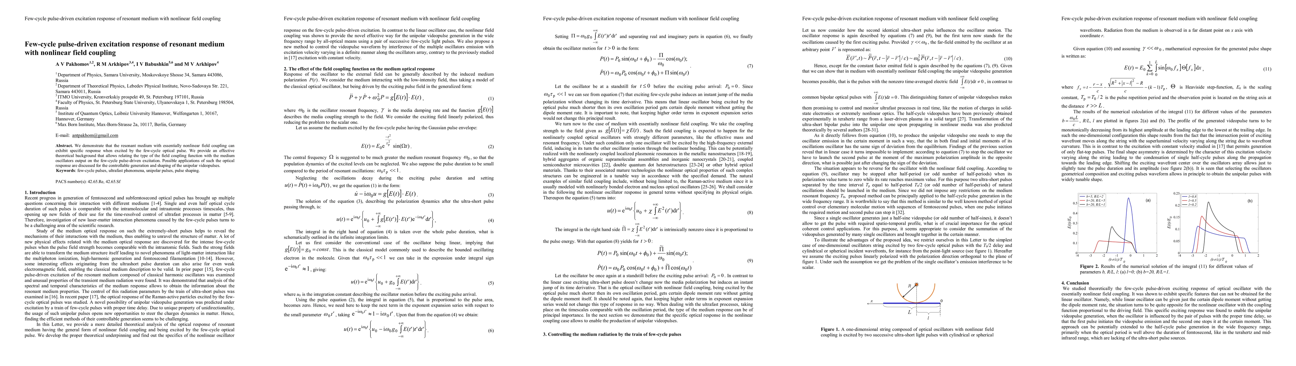 This paper explores the response of a resonant medium with nonlinear field coupling to few-cycle optical pulses, providing a theoretical framework to link the coupling function to the medium's output. Potential applications include the generation and shaping of unipolar video pulses.