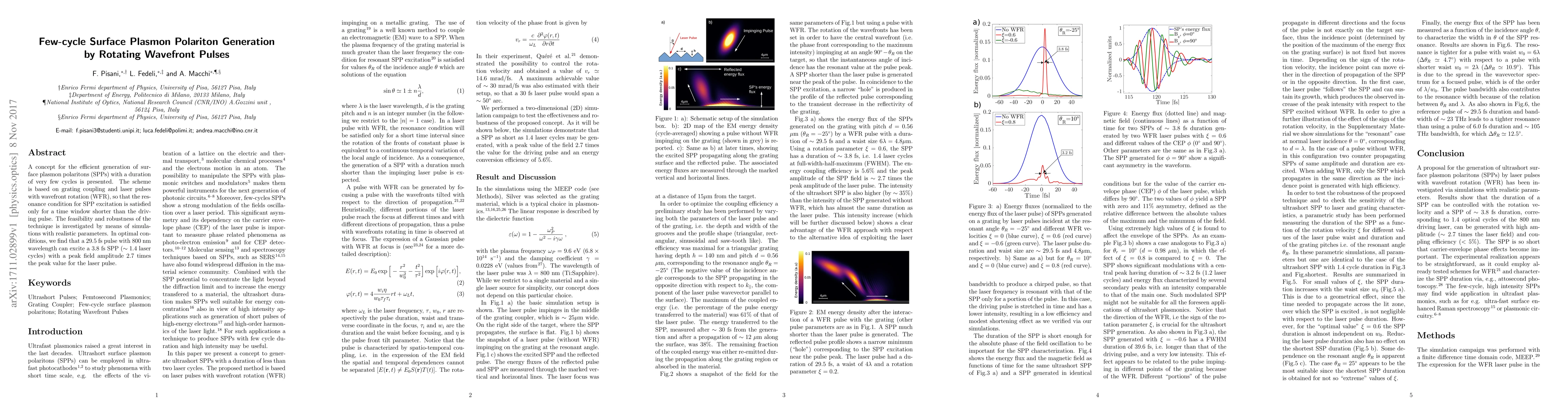 A concept for the efficient generation of surface plasmon polaritons (SPPs) with a duration of very few cycles is presented. The scheme is based on grating coupling and laser pulses with wavefront rotation (WFR), so that the resonance condition for SPP excitation is satisfied only for a time window shorter than the driving pulse. The feasibility and robustness of the technique is investigated by means of simulations with realistic parameters. In optimal conditions, we find that a $29.5$~fs pulse with $800$~nm wavelength can excite a $3.8$~fs SPP ($\sim 1.4$ laser cycles) with a peak field amplitude $2.7$ times the peak value for the laser pulse.