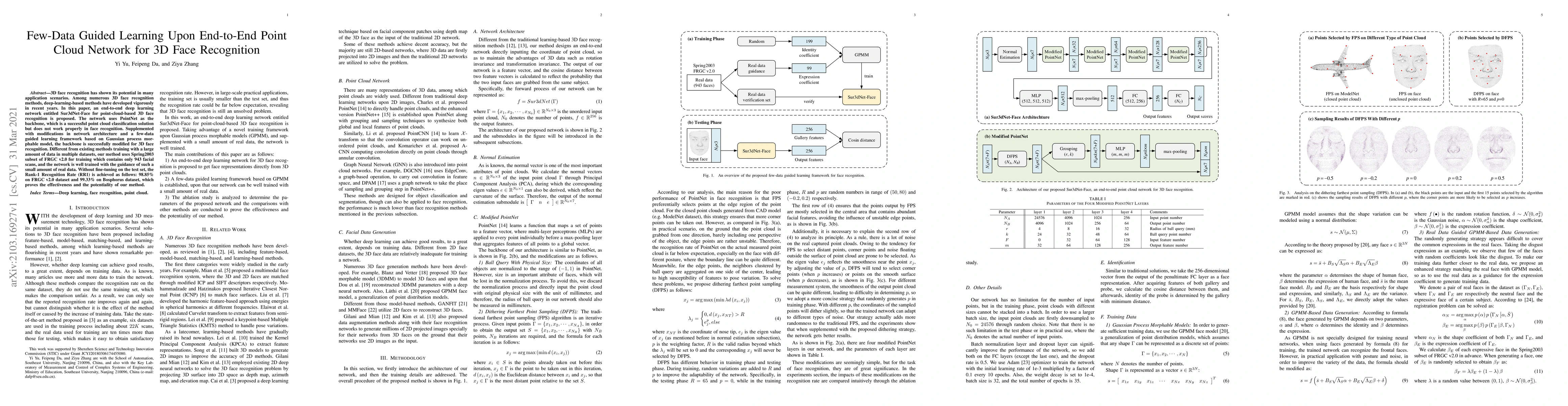 This paper proposes Sur3dNet-Face, an end-to-end deep learning network for point-cloud-based 3D face recognition, utilizing a few-data guided learning framework to achieve high accuracy with minimal training data. Despite training on only 943 scans, the method achieves 98.85% Rank-1 Recognition Rate on FRGC v2.0 and 99.33% on Bosphorus datasets.