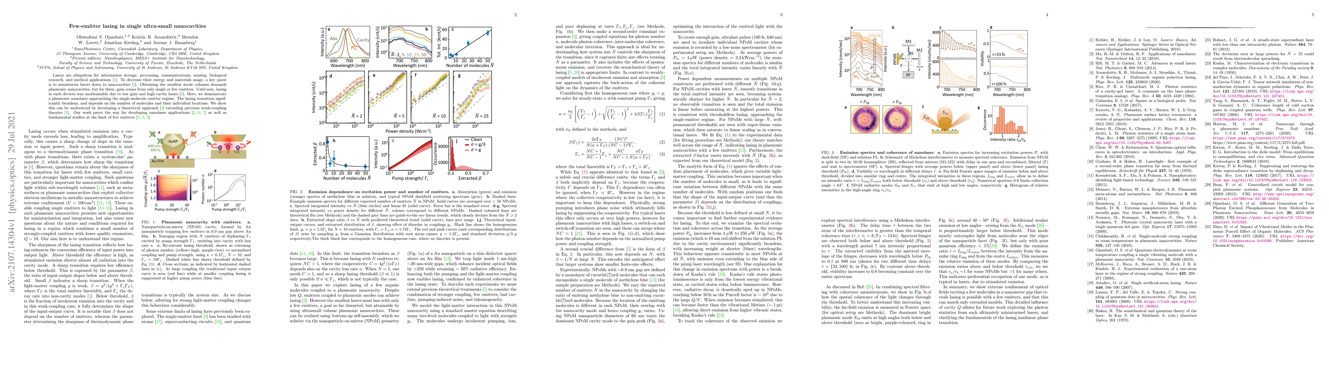 This research demonstrates the achievement of lasing in ultra-small plasmonic nanocavities utilizing few-emitter gain, overcoming previous challenges of low gain and high losses. The theoretical approach developed extends existing weak-coupling theories to explain the broadened lasing transition, paving the way for nanolaser applications and fundamental studies in the realm of single-molecule emitters.