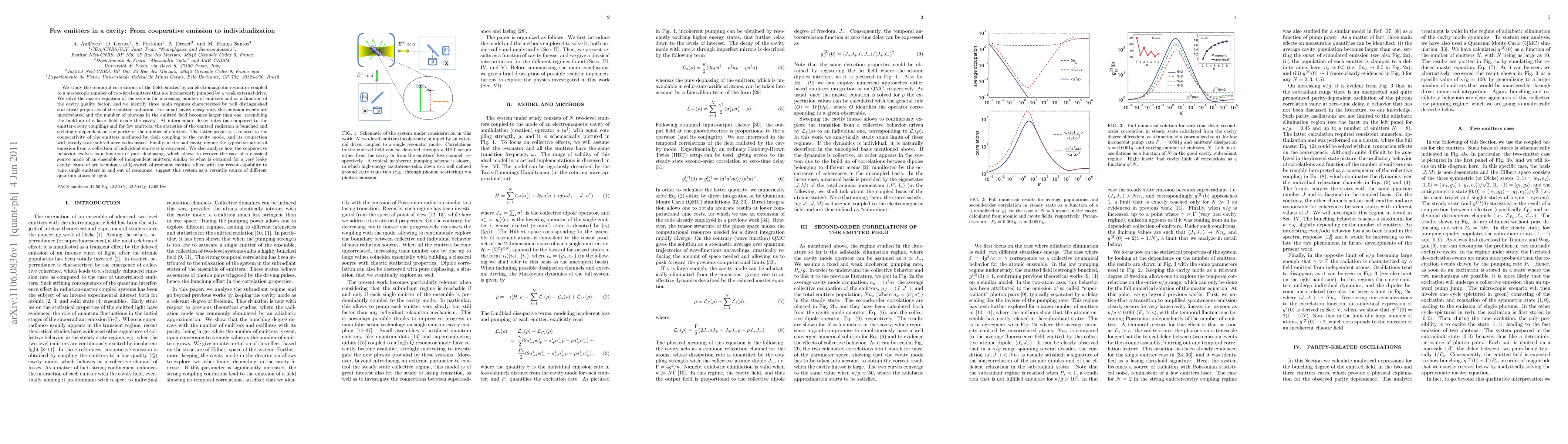 This paper investigates the dynamics of light emission from a cavity coupled to a mesoscopic number of two-level emitters, identifying three regimes: uncorrelated, cooperative, and individual emission. The study reveals how the statistical properties of emitted radiation change from laser-like behavior to subradiance and finally to independent emitters, depending on cavity decay rate and emitter-cavity coupling.
