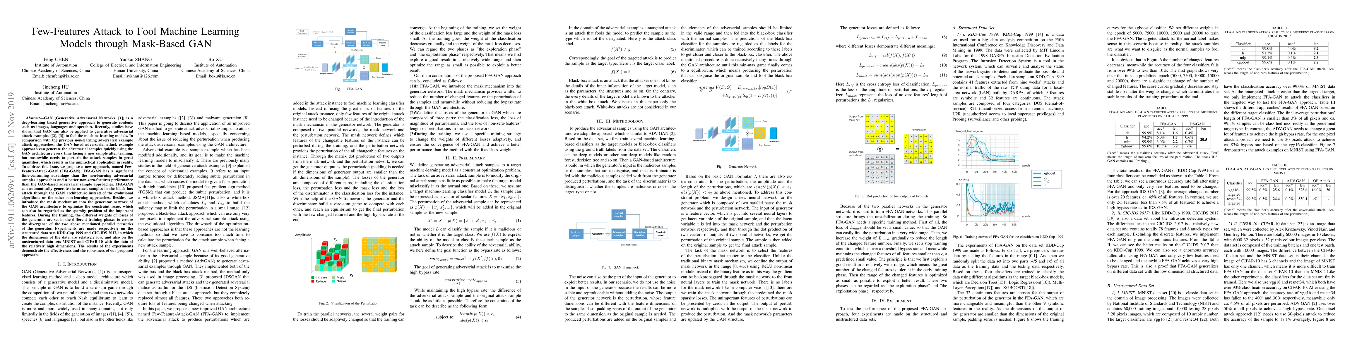 GAN is a deep-learning based generative approach to generate contents such as images, languages and speeches. Recently, studies have shown that GAN can also be applied to generative adversarial attack examples to fool the machine-learning models. In comparison with the previous non-learning adversarial example attack approaches, the GAN-based adversarial attack example approach can generate the adversarial samples quickly using the GAN architecture every time facing a new sample after training, but meanwhile needs to perturb the attack samples in great quantities, which results in the unpractical application in reality. To address this issue, we propose a new approach, named Few-Feature-Attack-GAN (FFA-GAN). FFA-GAN has a significant time-consuming advantage than the non-learning adversarial samples approaches and a better non-zero-features performance than the GANbased adversarial sample approaches. FFA-GAN can automatically generate the attack samples in the black-box attack through the GAN architecture instead of the evolutional algorithms or the other non-learning approaches. Besides, we introduce the mask mechanism into the generator network of the GAN architecture to optimize the constraint issue, which can also be regarded as the sparsity problem of the important features. During the training, the different weights of losses of the generator are set in the different training phases to ensure the divergence of the two above mentioned parallel networks of the generator. Experiments are made respectively on the structured data sets KDD-Cup 1999 and CIC-IDS 2017, in which the dimensions of the data are relatively low, and also on the unstructured data sets MNIST and CIFAR-10 with the data of the relatively high dimensions. The results of the experiments demonstrate the effectiveness and the robustness of our proposed approach.