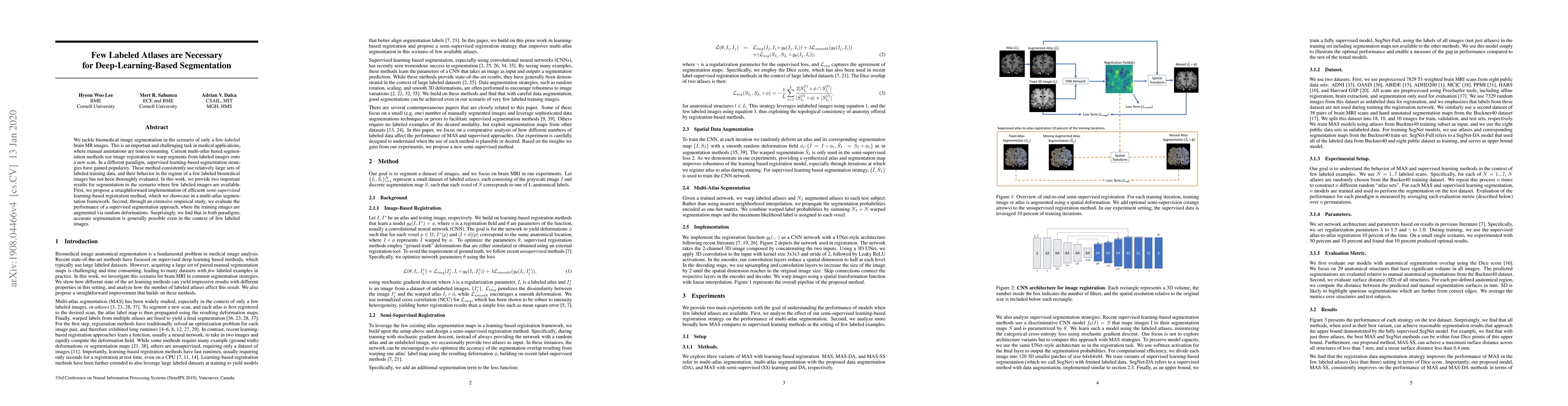We tackle biomedical image segmentation in the scenario of only a few labeled brain MR images. This is an important and challenging task in medical applications, where manual annotations are time-consuming. Current multi-atlas based segmentation methods use image registration to warp segments from labeled images onto a new scan. In a different paradigm, supervised learning-based segmentation strategies have gained popularity. These method consistently use relatively large sets of labeled training data, and their behavior in the regime of a few labeled biomedical images has not been thoroughly evaluated. In this work, we provide two important results for segmentation in the scenario where few labeled images are available. First, we propose a straightforward implementation of efficient semi-supervised learning-based registration method, which we showcase in a multi-atlas segmentation framework. Second, through an extensive empirical study, we evaluate the performance of a supervised segmentation approach, where the training images are augmented via random deformations. Surprisingly, we find that in both paradigms, accurate segmentation is generally possible even in the context of few labeled images.