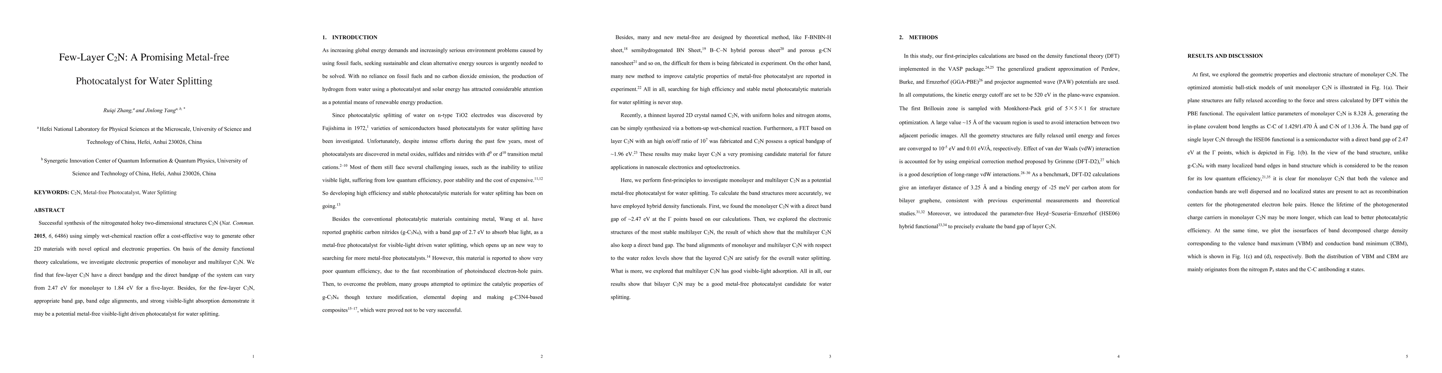 Successful synthesis of the nitrogenated holey two-dimensional structures C2N (Nat. Commun. 2015, 6, 6486) using simply wet-chemical reaction offer a cost-effective way to generate other 2D materials with novel optical and electronic properties. On basis of the density functional theory calculations, we investigate electronic properties of monolayer and multilayer C2N. We find that few-layer C2N have a direct bandgap and the direct bandgap of the system can vary from 2.47 eV for monolayer to 1.84 eV for a five-layer. Besides, for the few-layer C2N, appropriate band gap, band edge alignments, and strong visible-light absorption demonstrate it may be a potential metal-free visible-light driven photocatalyst for water splitting.