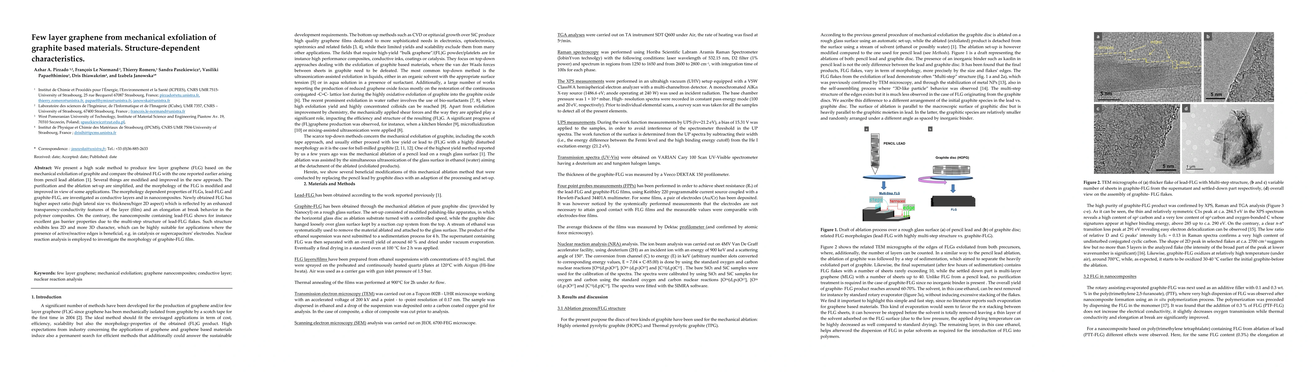 This paper presents an improved method for producing few layer graphene via mechanical exfoliation, achieving higher aspect ratios and better transparency-conductivity features compared to earlier pencil lead ablation methods. The study highlights the structure-dependent properties of the graphene, showing enhanced performance in polymer composites and superior gas barrier properties in nanocomposites due to the multistep structure of lead FLG flakes.