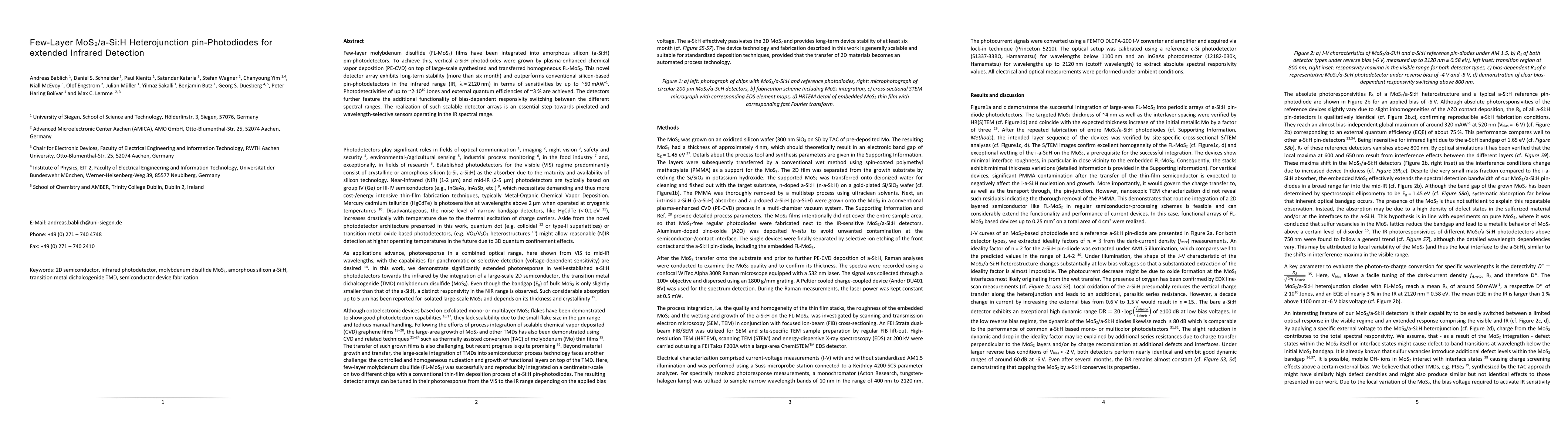 Few-layer molybdenum disulfide (FL-MoS$_2$) films have been integrated into amorphous silicon (a-Si:H) pin photodetectors. To achieve this, vertical a-Si:H photodiodes were grown by plasma-enhanced chemical vapor deposition (PE-CVD) on top of large-scale synthesized and transferred homogeneous FL-MoS$_2$. This novel detector array exhibits long-term stability (more than six month) and outperforms conventional silicon-based pin photodetectors in the infrared range (IR, $\lambda$ = 2120 nm) in terms of sensitivities by up to 50 mAW$^{-1}$. Photodetectivities of up to 2 x 10$^{10}$ Jones and external quantum efficiencies of 3 % are achieved. The detectors further feature the additional functionality of bias-dependent responsivity switching between the different spectral ranges. The realization of such scalable detector arrays is an essential step towards pixelated and wavelength-selective sensors operating in the IR spectral range.