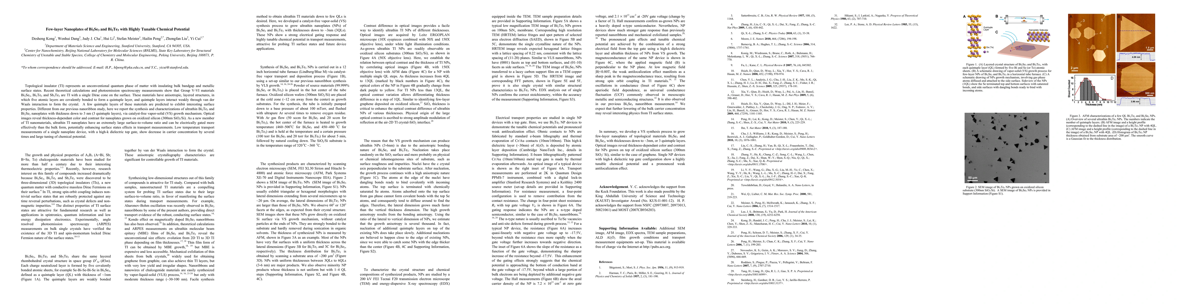 This paper details the synthesis of few-layer Bi2Se3 and Bi2Te3 nanoplates using a catalyst-free vapor-solid growth technique, showing thickness-dependent optical properties. The ultrathin nanoplates exhibit significant surface-to-volume ratios and tunable chemical potentials, as demonstrated by low-temperature transport measurements, indicating enhanced surface states effects.
