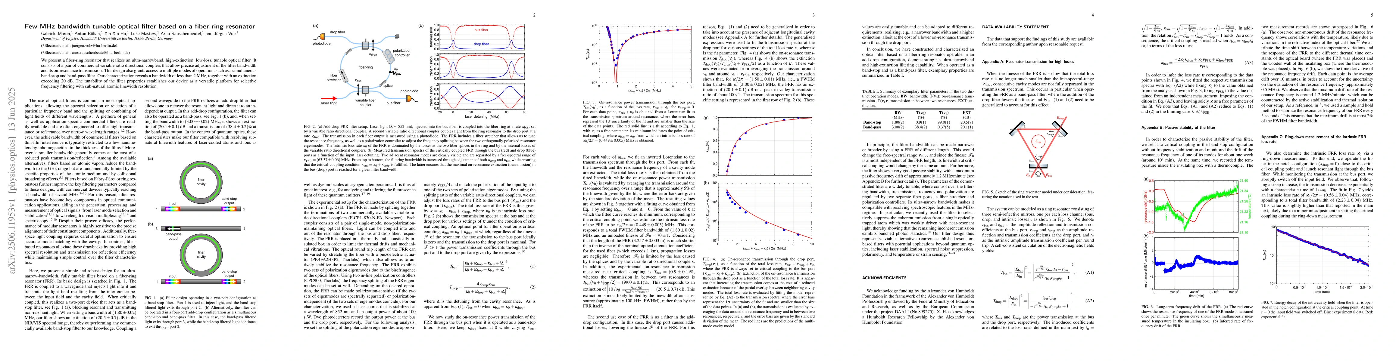 We present a fiber-ring resonator that realizes an ultra-narrowband, high-extinction, low-loss, tunable optical filter. It consists of a pair of commercial variable ratio directional couplers that allow precise adjustment of the filter bandwidth and its on-resonance transmission. This design also grants access to multiple modes of operation, such as a simultaneous band-stop and band-pass filter. Our characterization reveals a bandwidth of less than 2 MHz, together with an extinction exceeding 20 dB. The tunability of the filter properties establishes our device as a versatile platform for selective frequency filtering with sub-natural atomic linewidth resolution.