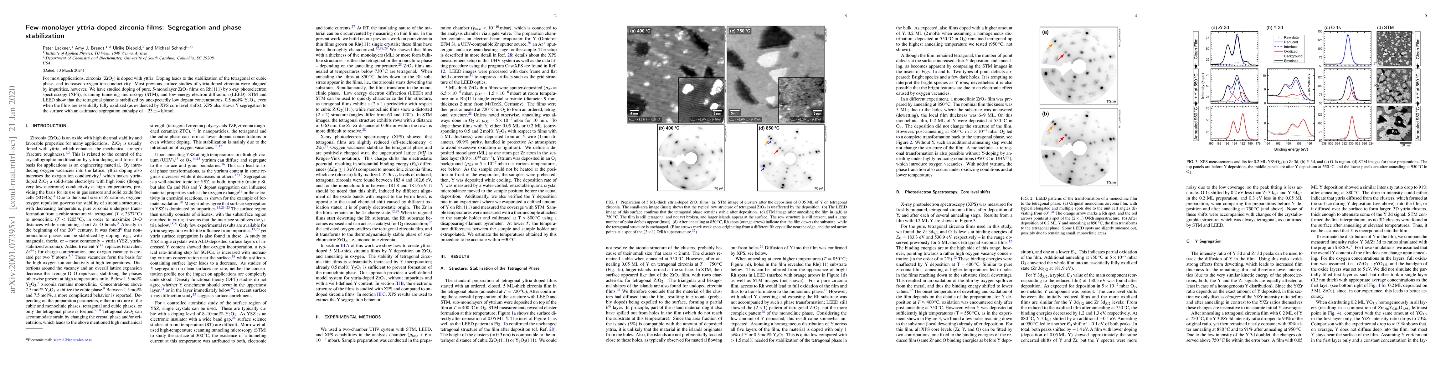 This study investigates the stabilization of the tetragonal phase in few-monolayer yttria-doped zirconia films using advanced surface analysis techniques. The results reveal that low dopant concentrations (0.5 mol% Y2O3) can stabilize the tetragonal phase, and yttrium segregates to the surface with a segregation enthalpy of $-23 \pm 4$ kJ/mol.