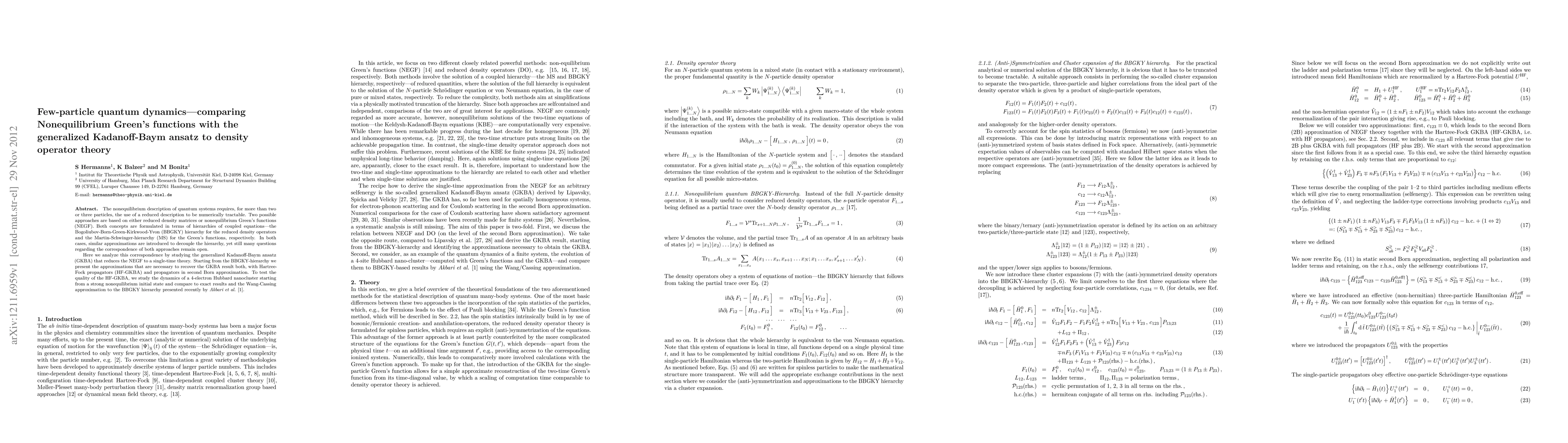 This paper compares the nonequilibrium dynamics of few-particle quantum systems using Nonequilibrium Green's functions (NEGF) and the generalized Kadanoff-Baym ansatz with density operator theory, focusing on the BBGKY and Martin-Schwinger hierarchies. It explores the similarities and differences in approximations used to decouple these hierarchies, highlighting open questions regarding their correspondence.