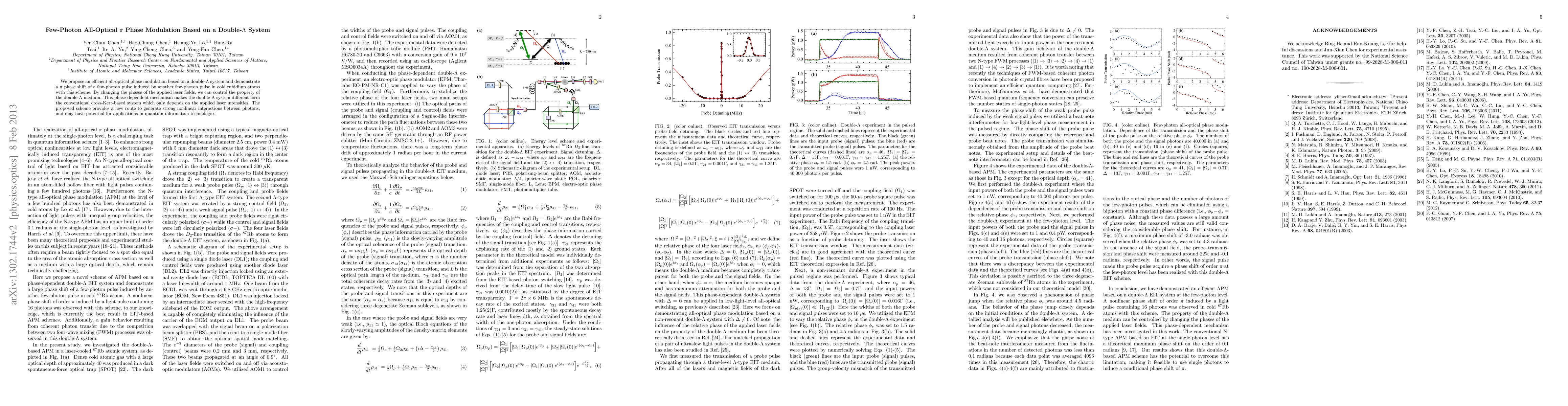 This paper proposes an efficient all-optical phase modulation scheme using a double-{\Lambda} system in cold rubidium atoms, demonstrating a {\pi} phase shift of few-photon pulses. Unlike conventional systems, this method controls phase shifts via laser field phases, offering a new route for strong photon interactions with potential for quantum information technologies.