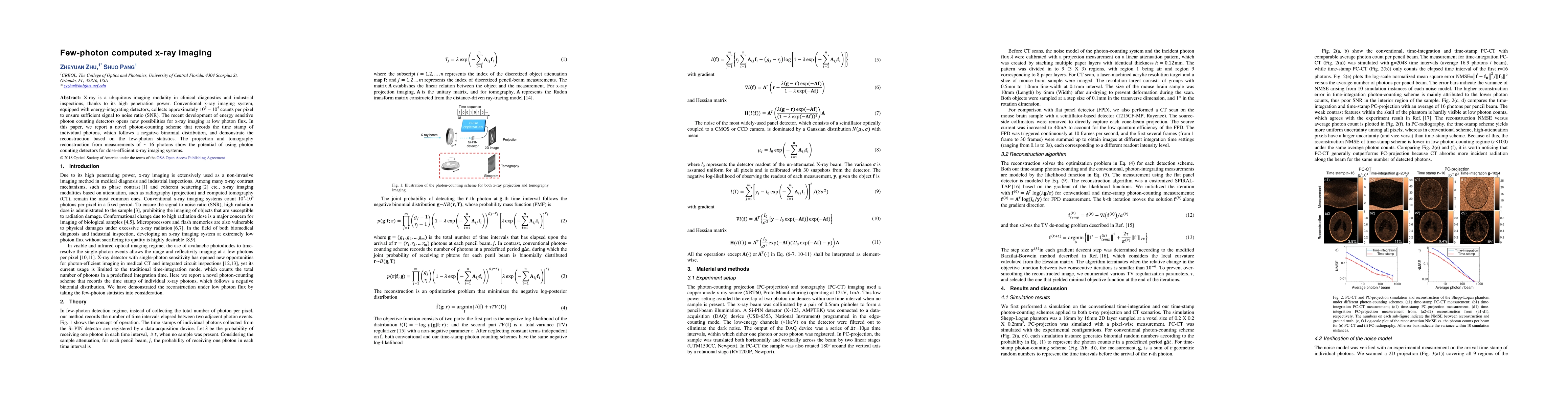 X-ray is a ubiquitous imaging modality in clinical diagnostics and industrial inspections, thanks to its high penetration power. Conventional x-ray imaging system, equipped with energy-integrating detectors, collects approximately 1000 to 10000 counts per pixel to ensure sufficient signal to noise ratio (SNR). The recent development of energy sensitive photon counting detectors opens new possibilities for x-ray imaging at low photon flux. In this letter, we report a novel photon-counting scheme that records the time stamp of individual photons, which follows a negative binomial distribution, and demonstrated the reconstruction based on the few-photon statistics. The projection and tomography reconstruction from measurements of roughly 10 photons shows the potential of using photon counting detectors for dose-efficient x-ray imaging systems.