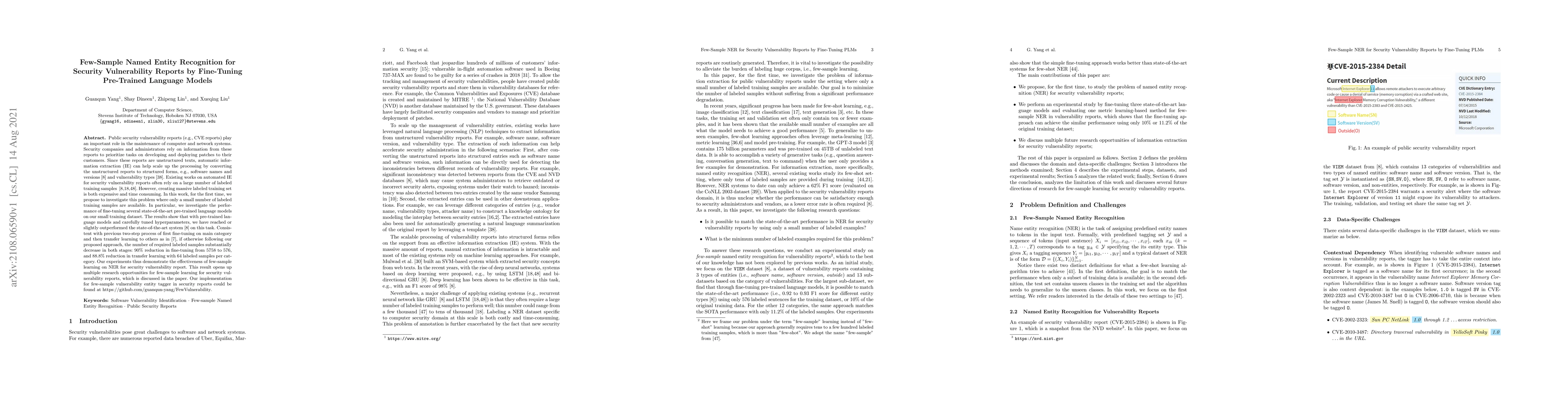 This paper proposes a method for few-sample named entity recognition (NER) in security vulnerability reports using fine-tuned pre-trained language models, achieving competitive results with significantly fewer labeled training samples. The approach reduces the required labeled samples by 90% during fine-tuning and 88.8% in transfer learning, demonstrating the effectiveness of few-sample learning for this task.