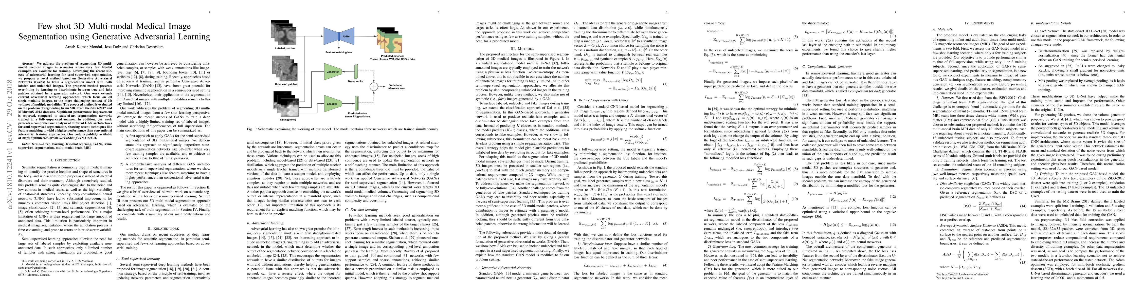 This paper proposes a novel method using Generative Adversarial Networks (GANs) for few-shot 3D multi-modal medical image segmentation, significantly improving performance over fully-supervised approaches. The method extends adversarial learning to 3D volumes and demonstrates superior results using feature matching techniques.