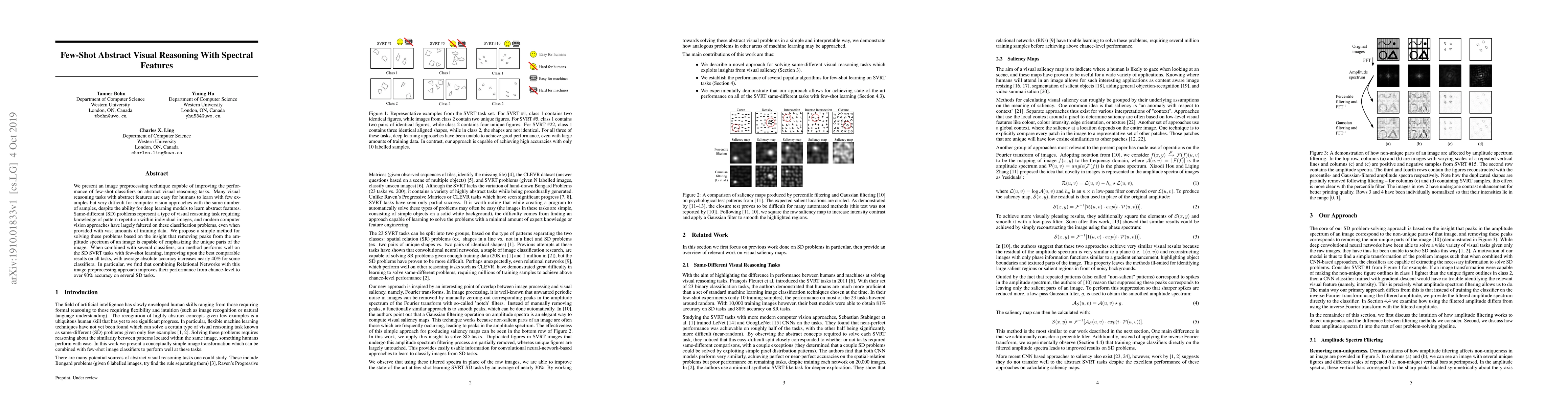 This paper introduces an image preprocessing technique that enhances few-shot classifiers for abstract visual reasoning tasks by removing peaks from the amplitude spectrum to emphasize unique image parts. This method, when used with Relational Networks, significantly improves performance on same-different classification problems, achieving over 90% accuracy.