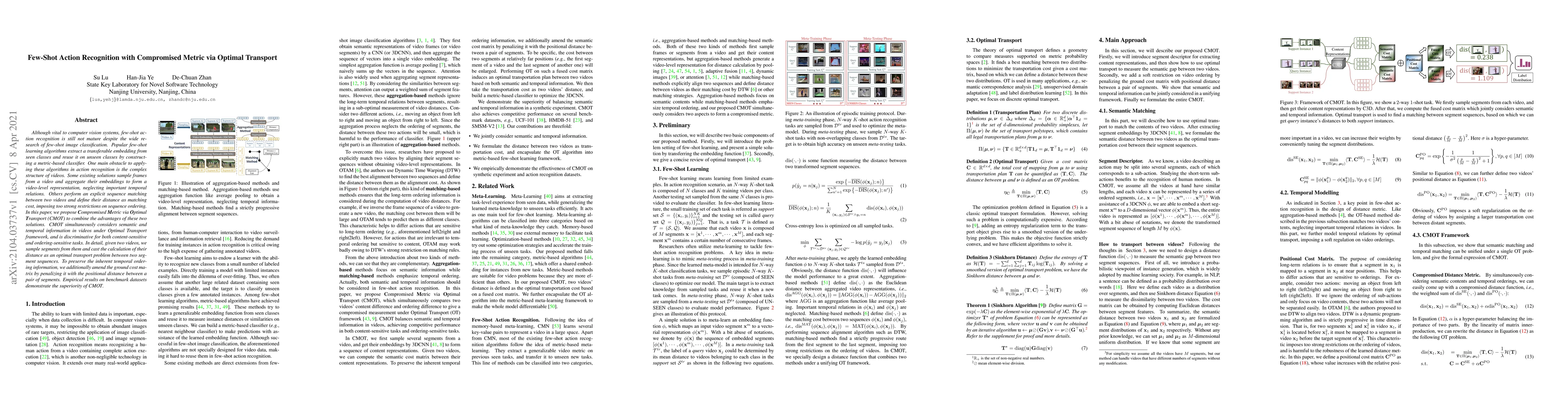 This paper proposes Compromised Metric via Optimal Transport (CMOT) for few-shot action recognition, addressing the complex structure of videos by combining semantic and temporal information. CMOT samples video segments and uses optimal transport to calculate their distance, preserving temporal ordering, and outperforms existing methods on benchmark datasets.