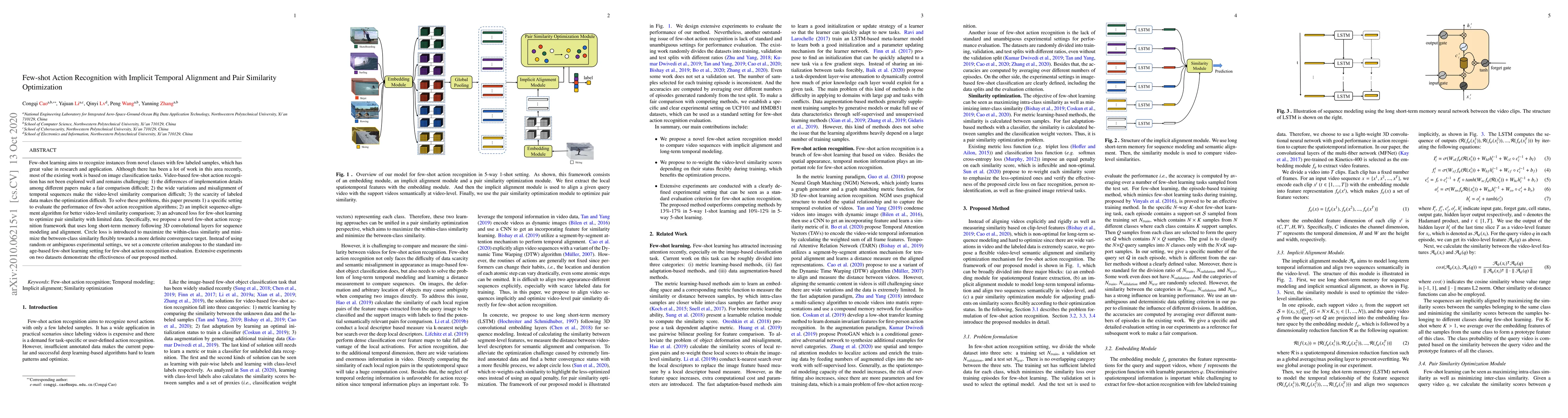 Few-shot learning aims to recognize instances from novel classes with few labeled samples, which has great value in research and application. Although there has been a lot of work in this area recently, most of the existing work is based on image classification tasks. Video-based few-shot action recognition has not been explored well and remains challenging: 1) the differences of implementation details among different papers make a fair comparison difficult; 2) the wide variations and misalignment of temporal sequences make the video-level similarity comparison difficult; 3) the scarcity of labeled data makes the optimization difficult. To solve these problems, this paper presents 1) a specific setting to evaluate the performance of few-shot action recognition algorithms; 2) an implicit sequence-alignment algorithm for better video-level similarity comparison; 3) an advanced loss for few-shot learning to optimize pair similarity with limited data. Specifically, we propose a novel few-shot action recognition framework that uses long short-term memory following 3D convolutional layers for sequence modeling and alignment. Circle loss is introduced to maximize the within-class similarity and minimize the between-class similarity flexibly towards a more definite convergence target. Instead of using random or ambiguous experimental settings, we set a concrete criterion analogous to the standard image-based few-shot learning setting for few-shot action recognition evaluation. Extensive experiments on two datasets demonstrate the effectiveness of our proposed method.