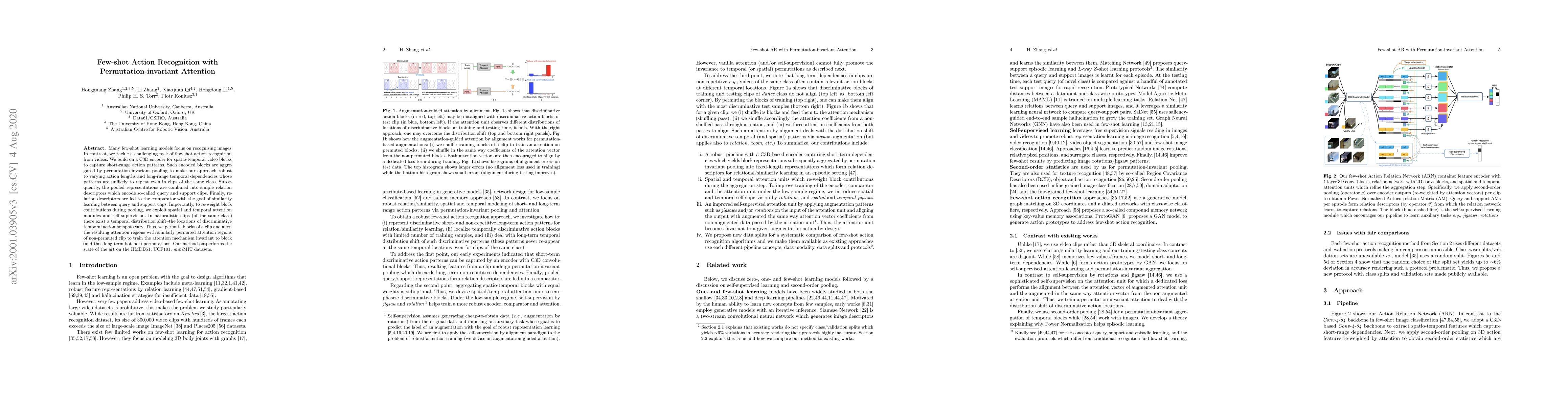 Many few-shot learning models focus on recognising images. In contrast, we tackle a challenging task of few-shot action recognition from videos. We build on a C3D encoder for spatio-temporal video blocks to capture short-range action patterns. Such encoded blocks are aggregated by permutation-invariant pooling to make our approach robust to varying action lengths and long-range temporal dependencies whose patterns are unlikely to repeat even in clips of the same class. Subsequently, the pooled representations are combined into simple relation descriptors which encode so-called query and support clips. Finally, relation descriptors are fed to the comparator with the goal of similarity learning between query and support clips. Importantly, to re-weight block contributions during pooling, we exploit spatial and temporal attention modules and self-supervision. In naturalistic clips (of the same class) there exists a temporal distribution shift--the locations of discriminative temporal action hotspots vary. Thus, we permute blocks of a clip and align the resulting attention regions with similarly permuted attention regions of non-permuted clip to train the attention mechanism invariant to block (and thus long-term hotspot) permutations. Our method outperforms the state of the art on the HMDB51, UCF101, miniMIT datasets.