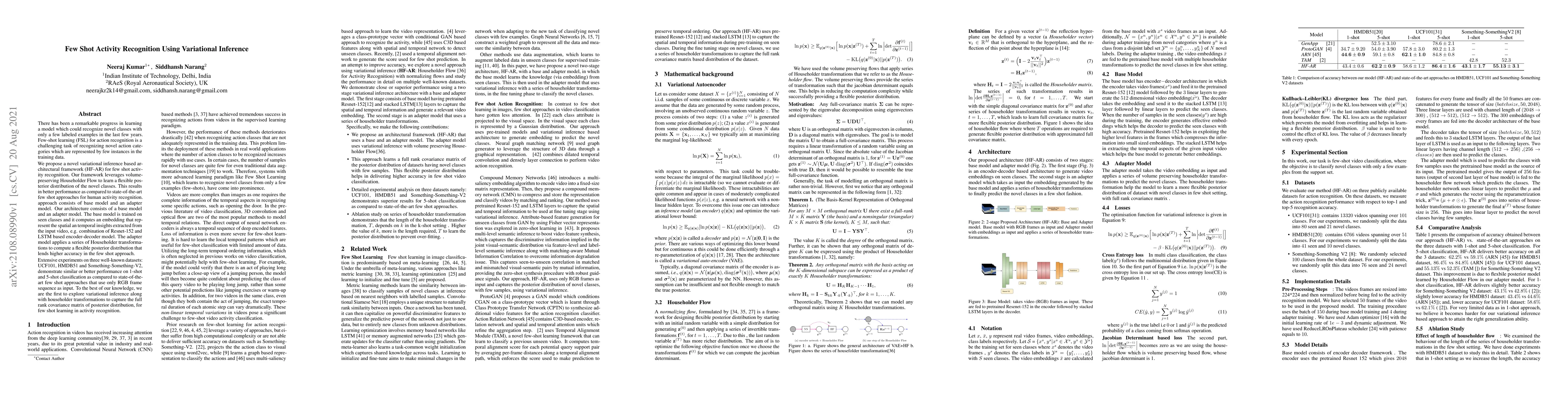 There has been a remarkable progress in learning a model which could recognise novel classes with only a few labeled examples in the last few years. Few-shot learning (FSL) for action recognition is a challenging task of recognising novel action categories which are represented by few instances in the training data. We propose a novel variational inference based architectural framework (HF-AR) for few shot activity recognition. Our framework leverages volume-preserving Householder Flow to learn a flexible posterior distribution of the novel classes. This results in better performance as compared to state-of-the-art few shot approaches for human activity recognition. approach consists of base model and an adapter model. Our architecture consists of a base model and an adapter model. The base model is trained on seen classes and it computes an embedding that represent the spatial and temporal insights extracted from the input video, e.g. combination of Resnet-152 and LSTM based encoder-decoder model. The adapter model applies a series of Householder transformations to compute a flexible posterior distribution that lends higher accuracy in the few shot approach. Extensive experiments on three well-known datasets: UCF101, HMDB51 and Something-Something-V2, demonstrate similar or better performance on 1-shot and 5-shot classification as compared to state-of-the-art few shot approaches that use only RGB frame sequence as input. To the best of our knowledge, we are the first to explore variational inference along with householder transformations to capture the full rank covariance matrix of posterior distribution, for few shot learning in activity recognition.