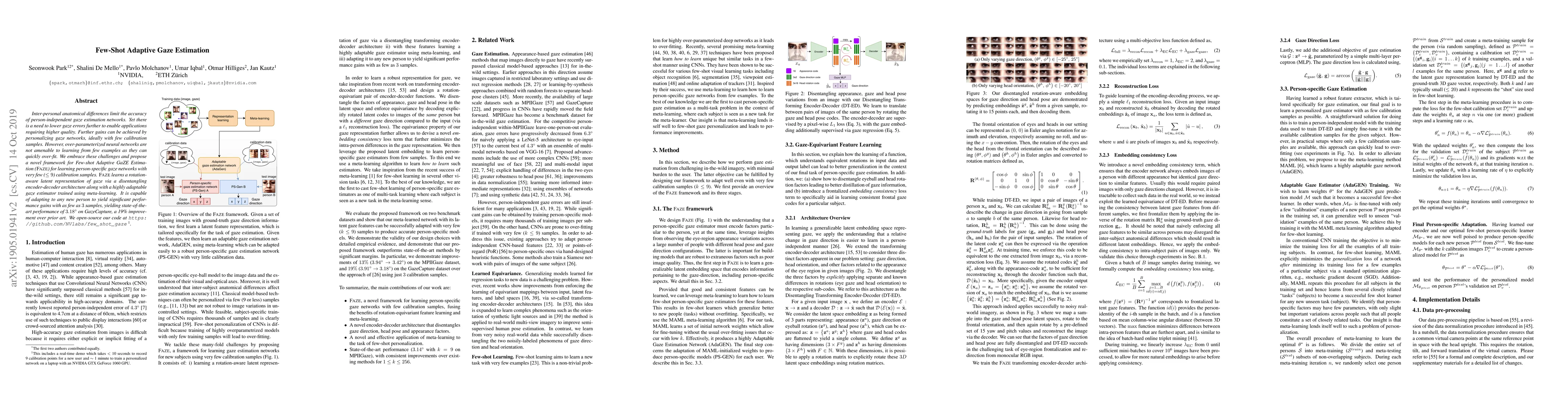 The paper proposes a novel framework called Few-shot Adaptive GaZE Estimation (FAZE) for learning person-specific gaze networks using as few as 3 calibration samples, achieving state-of-the-art performance with a 19% improvement over prior methods. FAZE utilizes a disentangling encoder-decoder architecture and meta-learning for highly adaptable gaze estimation.