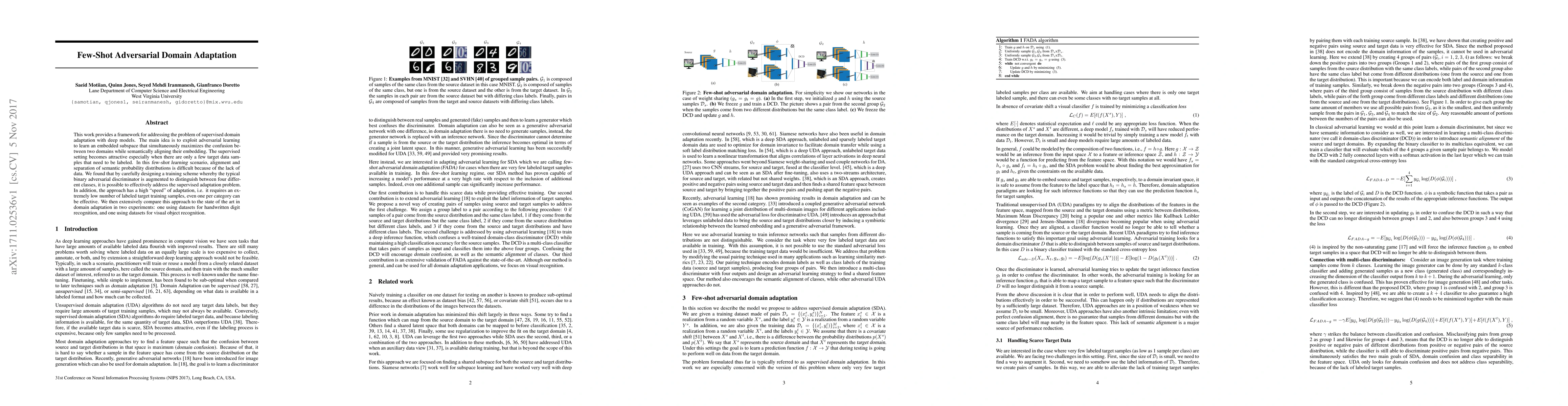 This paper introduces a framework for few-shot adversarial domain adaptation using deep models, leveraging adversarial learning to align and separate domain embeddings. The approach requires minimal labeled target samples, achieving effective adaptation even with just one sample per category.