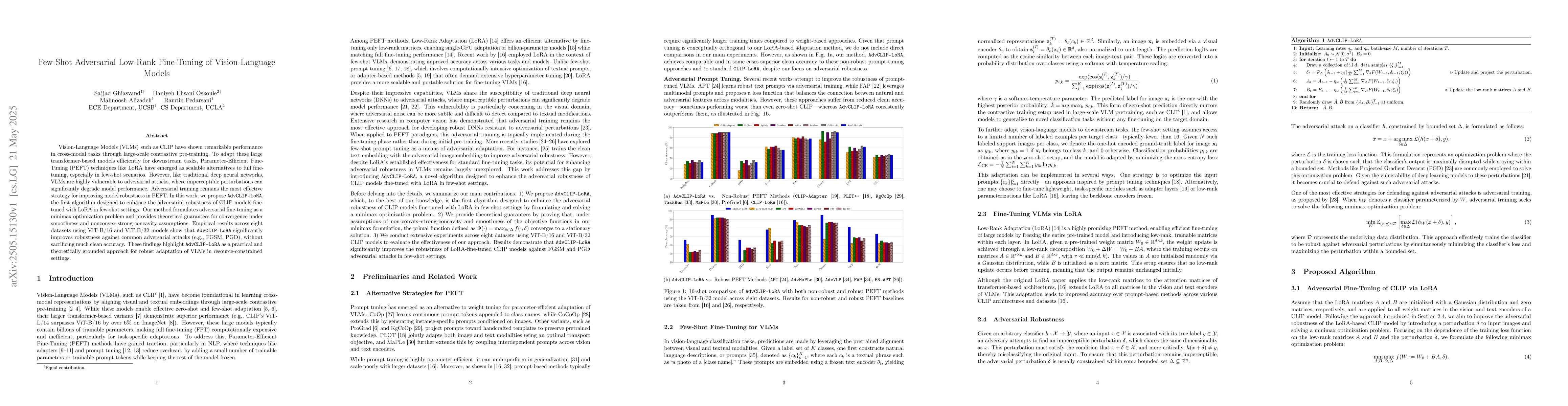 This research introduces the first algorithm (AdvCLIP-LoRA) specifically designed to enhance adversarial robustness in few-shot fine-tuned Vision-Language Models using LoRA.