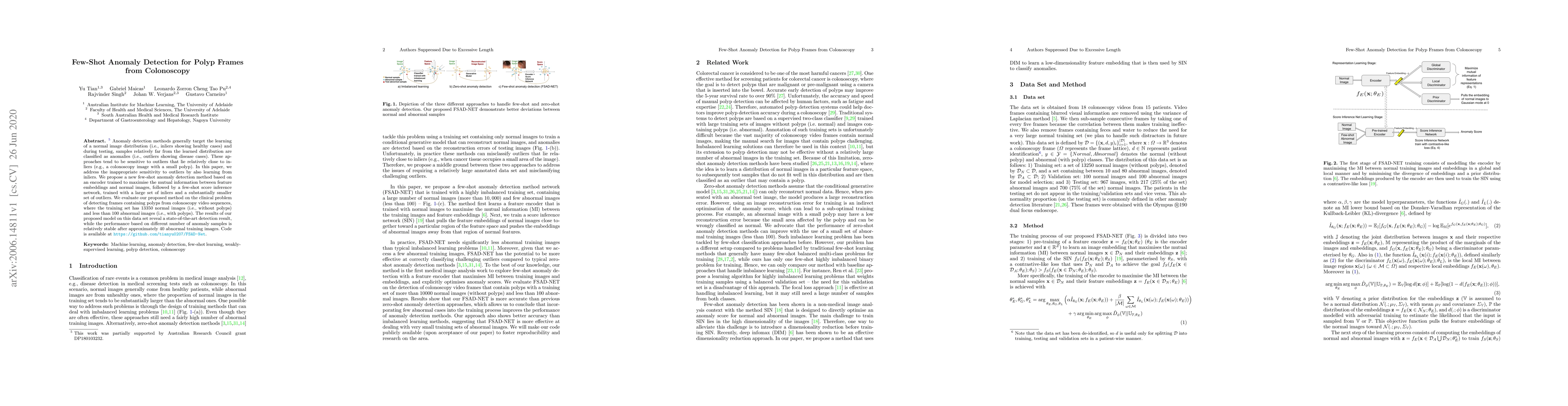 This paper proposes a novel few-shot anomaly detection method for identifying polyp frames in colonoscopy videos, addressing the challenge of detecting small polyps. The method trains an encoder to maximize mutual information between feature embeddings and normal images, followed by a few-shot inference network, achieving state-of-the-art detection results with stable performance after training on around 40 abnormal samples.