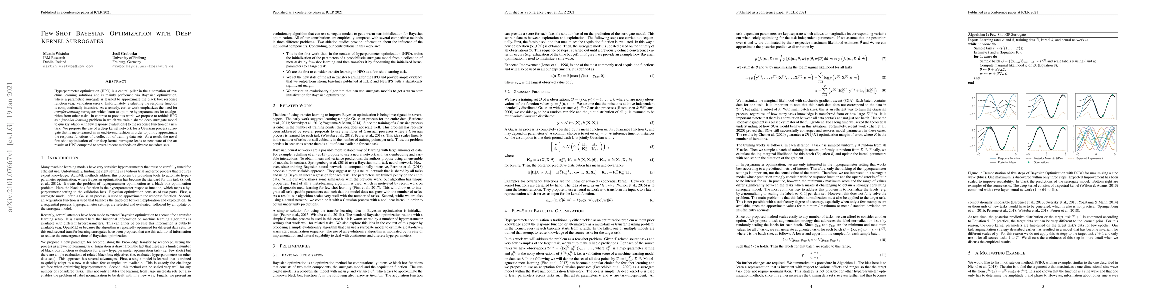 Hyperparameter optimization (HPO) is a central pillar in the automation of machine learning solutions and is mainly performed via Bayesian optimization, where a parametric surrogate is learned to approximate the black box response function (e.g. validation error). Unfortunately, evaluating the response function is computationally intensive. As a remedy, earlier work emphasizes the need for transfer learning surrogates which learn to optimize hyperparameters for an algorithm from other tasks. In contrast to previous work, we propose to rethink HPO as a few-shot learning problem in which we train a shared deep surrogate model to quickly adapt (with few response evaluations) to the response function of a new task. We propose the use of a deep kernel network for a Gaussian process surrogate that is meta-learned in an end-to-end fashion in order to jointly approximate the response functions of a collection of training data sets. As a result, the novel few-shot optimization of our deep kernel surrogate leads to new state-of-the-art results at HPO compared to several recent methods on diverse metadata sets.