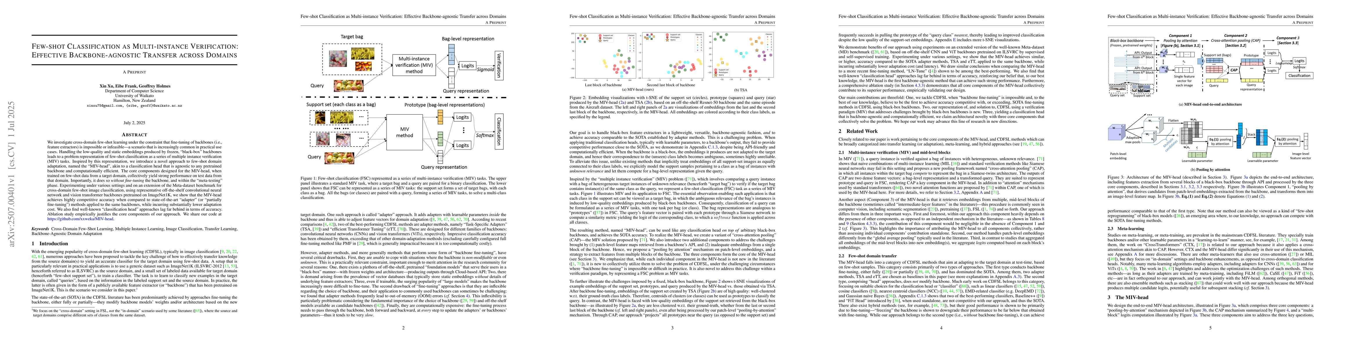 We investigate cross-domain few-shot learning under the constraint that fine-tuning of backbones (i.e., feature extractors) is impossible or infeasible -- a scenario that is increasingly common in practical use cases. Handling the low-quality and static embeddings produced by frozen, "black-box" backbones leads to a problem representation of few-shot classification as a series of multiple instance verification (MIV) tasks. Inspired by this representation, we introduce a novel approach to few-shot domain adaptation, named the "MIV-head", akin to a classification head that is agnostic to any pretrained backbone and computationally efficient. The core components designed for the MIV-head, when trained on few-shot data from a target domain, collectively yield strong performance on test data from that domain. Importantly, it does so without fine-tuning the backbone, and within the "meta-testing" phase. Experimenting under various settings and on an extension of the Meta-dataset benchmark for cross-domain few-shot image classification, using representative off-the-shelf convolutional neural network and vision transformer backbones pretrained on ImageNet1K, we show that the MIV-head achieves highly competitive accuracy when compared to state-of-the-art "adapter" (or partially fine-tuning) methods applied to the same backbones, while incurring substantially lower adaptation cost. We also find well-known "classification head" approaches lag far behind in terms of accuracy. Ablation study empirically justifies the core components of our approach. We share our code at https://github.com/xxweka/MIV-head.