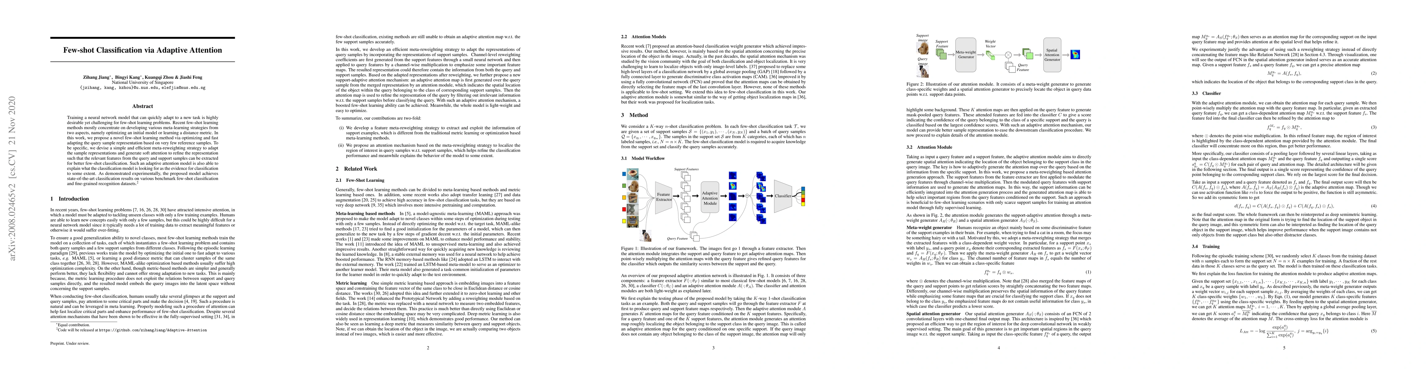 Training a neural network model that can quickly adapt to a new task is highly desirable yet challenging for few-shot learning problems. Recent few-shot learning methods mostly concentrate on developing various meta-learning strategies from two aspects, namely optimizing an initial model or learning a distance metric. In this work, we propose a novel few-shot learning method via optimizing and fast adapting the query sample representation based on very few reference samples. To be specific, we devise a simple and efficient meta-reweighting strategy to adapt the sample representations and generate soft attention to refine the representation such that the relevant features from the query and support samples can be extracted for a better few-shot classification. Such an adaptive attention model is also able to explain what the classification model is looking for as the evidence for classification to some extent. As demonstrated experimentally, the proposed model achieves state-of-the-art classification results on various benchmark few-shot classification and fine-grained recognition datasets.