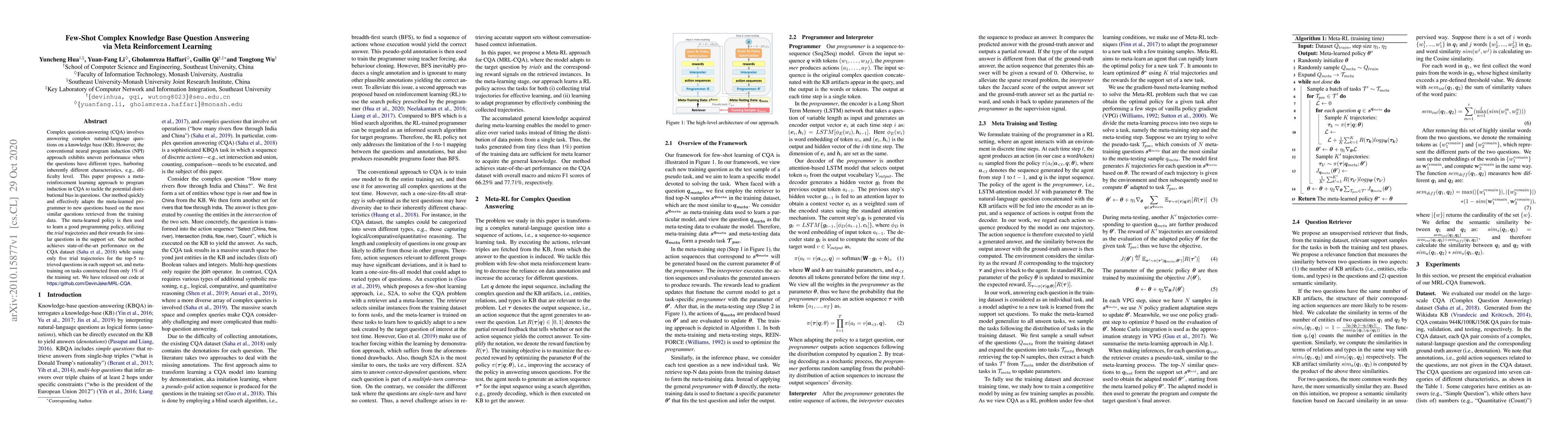 This paper proposes a meta-reinforcement learning approach for few-shot complex knowledge base question answering, addressing uneven performance across question types. It achieves state-of-the-art results using only five trial trajectories and metatraining on a small subset of the training data.