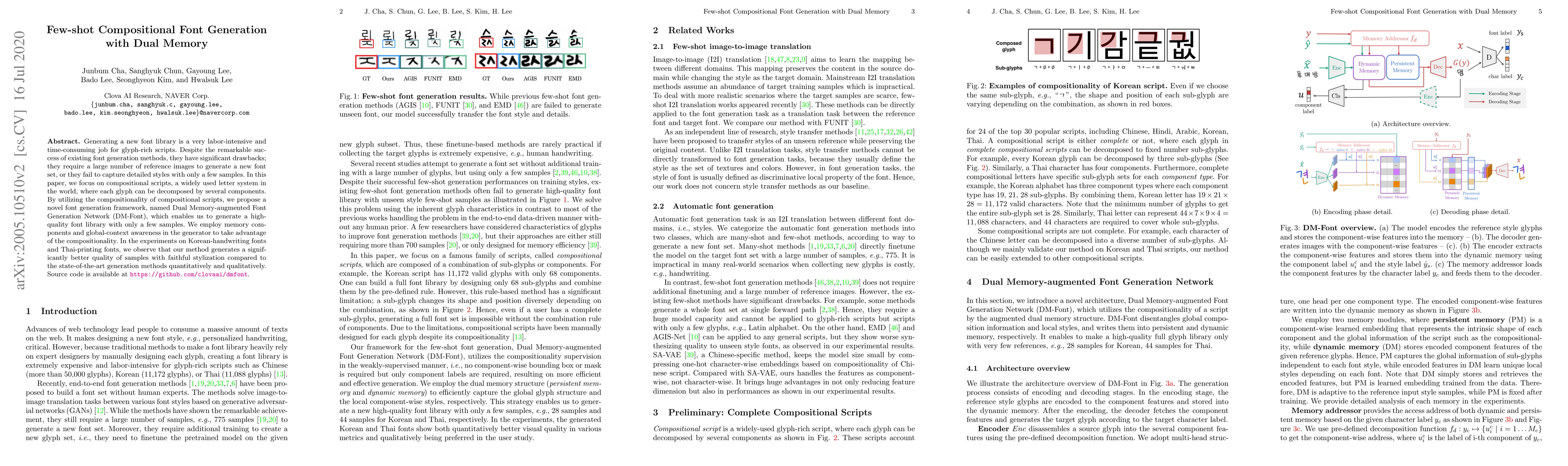Generating a new font library is a very labor-intensive and time-consuming job for glyph-rich scripts. Despite the remarkable success of existing font generation methods, they have significant drawbacks; they require a large number of reference images to generate a new font set, or they fail to capture detailed styles with only a few samples. In this paper, we focus on compositional scripts, a widely used letter system in the world, where each glyph can be decomposed by several components. By utilizing the compositionality of compositional scripts, we propose a novel font generation framework, named Dual Memory-augmented Font Generation Network (DM-Font), which enables us to generate a high-quality font library with only a few samples. We employ memory components and global-context awareness in the generator to take advantage of the compositionality. In the experiments on Korean-handwriting fonts and Thai-printing fonts, we observe that our method generates a significantly better quality of samples with faithful stylization compared to the state-of-the-art generation methods quantitatively and qualitatively. Source code is available at https://github.com/clovaai/dmfont.