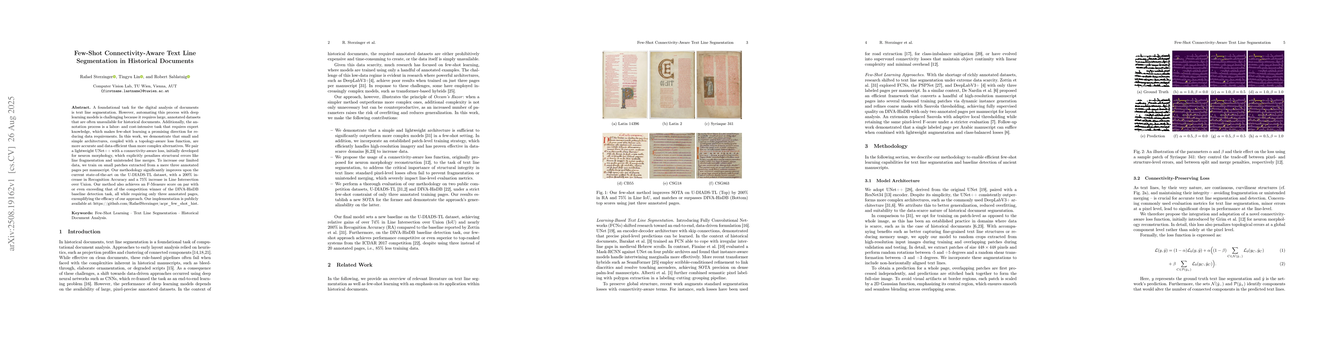 A foundational task for the digital analysis of documents is text line segmentation. However, automating this process with deep learning models is challenging because it requires large, annotated datasets that are often unavailable for historical documents. Additionally, the annotation process is a labor- and cost-intensive task that requires expert knowledge, which makes few-shot learning a promising direction for reducing data requirements. In this work, we demonstrate that small and simple architectures, coupled with a topology-aware loss function, are more accurate and data-efficient than more complex alternatives. We pair a lightweight UNet++ with a connectivity-aware loss, initially developed for neuron morphology, which explicitly penalizes structural errors like line fragmentation and unintended line merges. To increase our limited data, we train on small patches extracted from a mere three annotated pages per manuscript. Our methodology significantly improves upon the current state-of-the-art on the U-DIADS-TL dataset, with a 200% increase in Recognition Accuracy and a 75% increase in Line Intersection over Union. Our method also achieves an F-Measure score on par with or even exceeding that of the competition winner of the DIVA-HisDB baseline detection task, all while requiring only three annotated pages, exemplifying the efficacy of our approach. Our implementation is publicly available at: https://github.com/RafaelSterzinger/acpr_few_shot_hist.