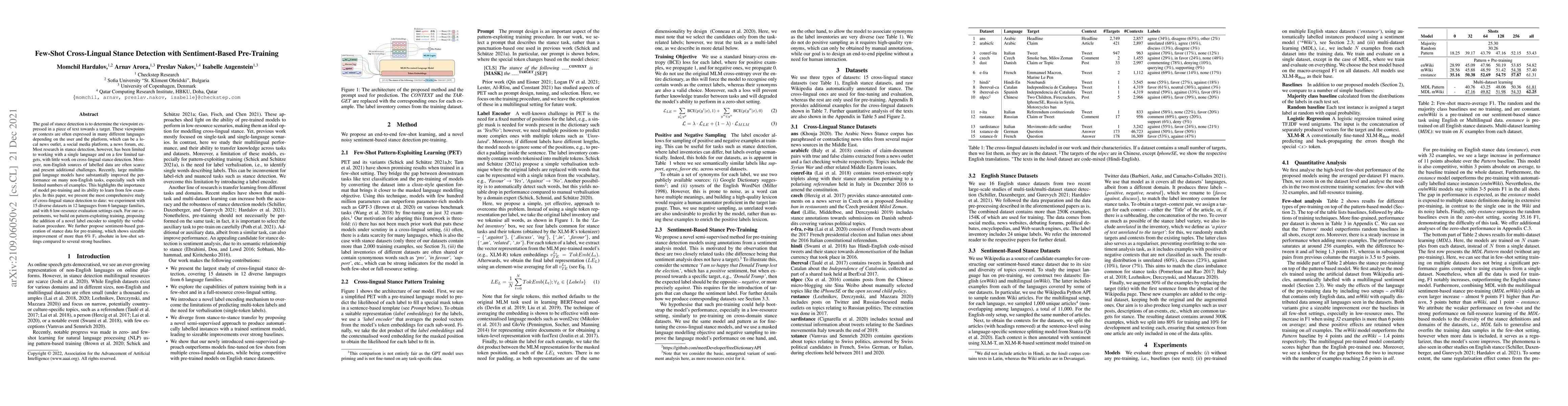 This paper explores few-shot cross-lingual stance detection, addressing the scarcity of non-English labeled data. It introduces a sentiment-based pre-training method and a novel label encoder, achieving over 6% improvement in F1 score in low-resource settings across 15 diverse datasets in 12 languages.