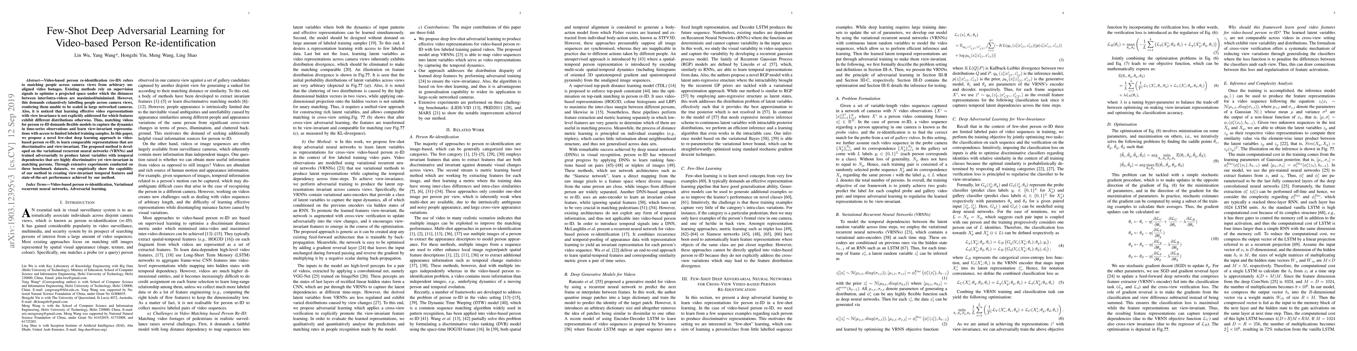 This paper proposes a few-shot deep adversarial learning approach using variational recurrent neural networks (VRNNs) for video-based person re-identification, aiming to learn discriminative and view-invariant representations with limited labeled training samples. The method achieves state-of-the-art performance on benchmark datasets by capturing temporal dynamics and generating temporal features that are invariant across different camera views.